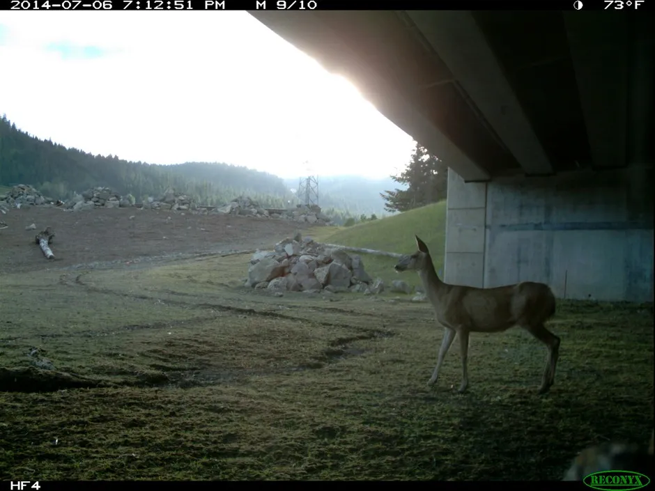 在华盛顿州,视频中捕捉到的一只鹿使用斯诺夸尔米山口。华盛顿州交通部/路透社围栏通常与其他过路基础设施一起建立,因为它们是另一种可以将动物与潜伏在森林边缘的高速公路隔开的工具。在班夫,围栏和地下/高架通道的结合力量据报道 将交通事故的发生率降低了80%。