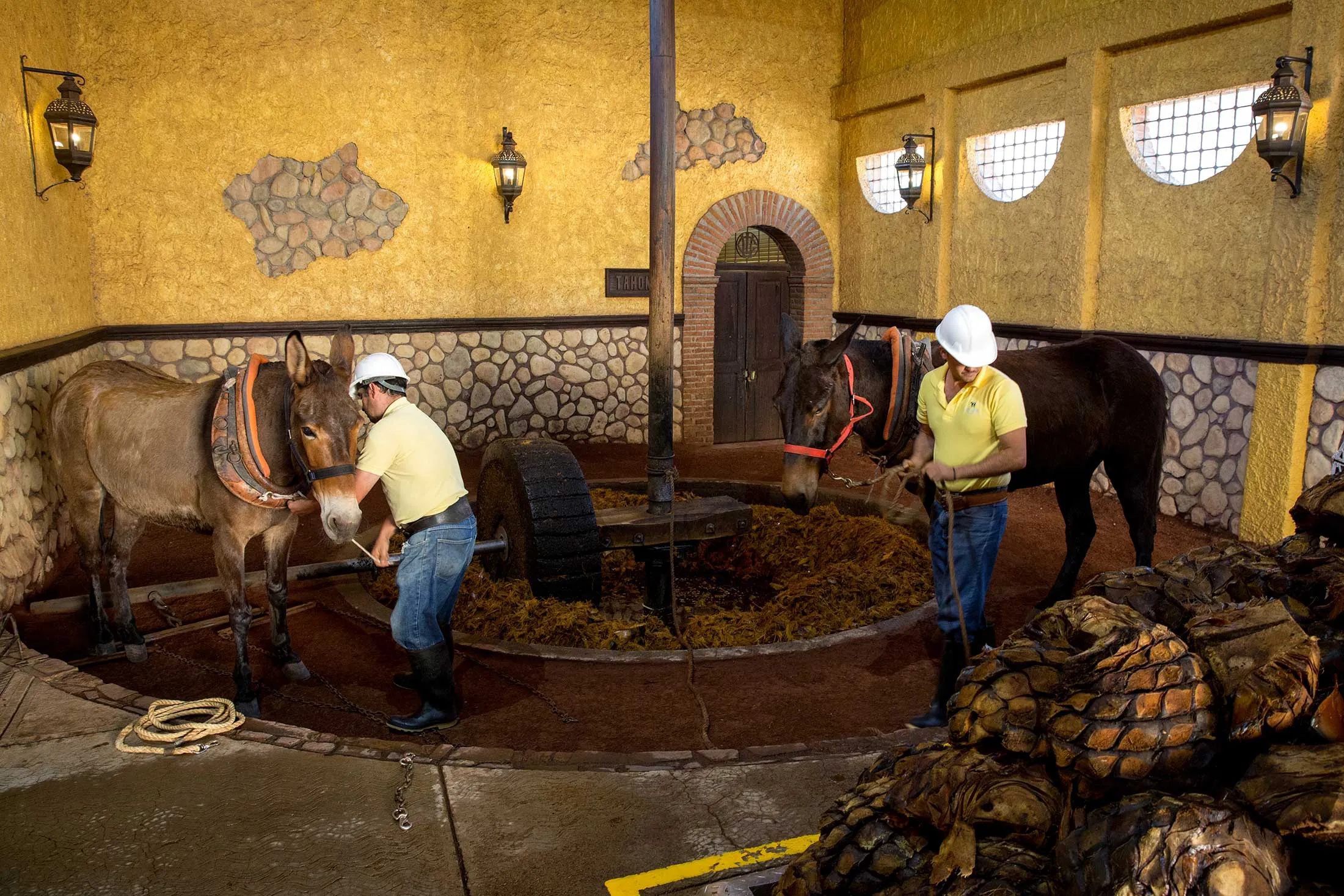 在Siete Leguas,最后一家使用动物动力进行磨粉的龙舌兰蒸馏厂的员工和骡子队。摄影师:玛丽·安妮·安德烈两年后,努涅斯为他找到了在El Viejito担任生产经理的工作。阿尔卡拉斯在蒸馏室里搭了一个床铺,睡在那里,以便学习铜锅和线圈在每个蒸馏阶段的声音。在烈酒公司La Madrileña雇佣El Viejito制作其龙舌兰后,阿尔卡拉斯进行了实验,直到找到一种高效的发酵酵母,用于一条出口到美国的产品,名为Two Fingers Tequila。Two Fingers以一个名为奥尔特加的两指男人的虚构故事进行营销,吸引了派对者,而非鉴赏家。它大获成功,成为第一个乘着60年代和70年代初由何塞·库埃尔沃、索萨和埃尔哈杜拉等大牌品牌开启的成功浪潮的新品牌。