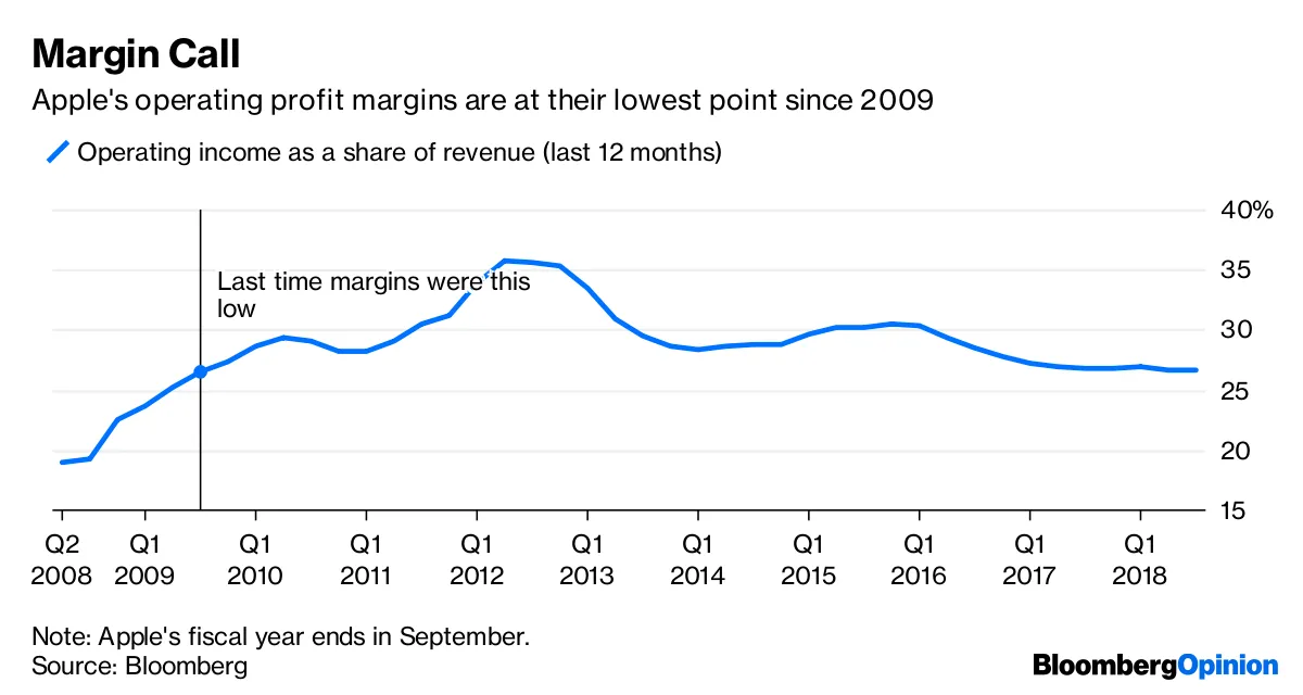 但我们可能有一天会回顾这一时刻,意识到这更多是对过去辉煌的奖励,而不是对苹果未来盈利能力的精准衡量。希拉·奥维德指出,苹果在达到1万亿美元,或者47个埃隆·马斯克的过程中发生了很大变化。其利润率缩小了,这是其中一个原因: