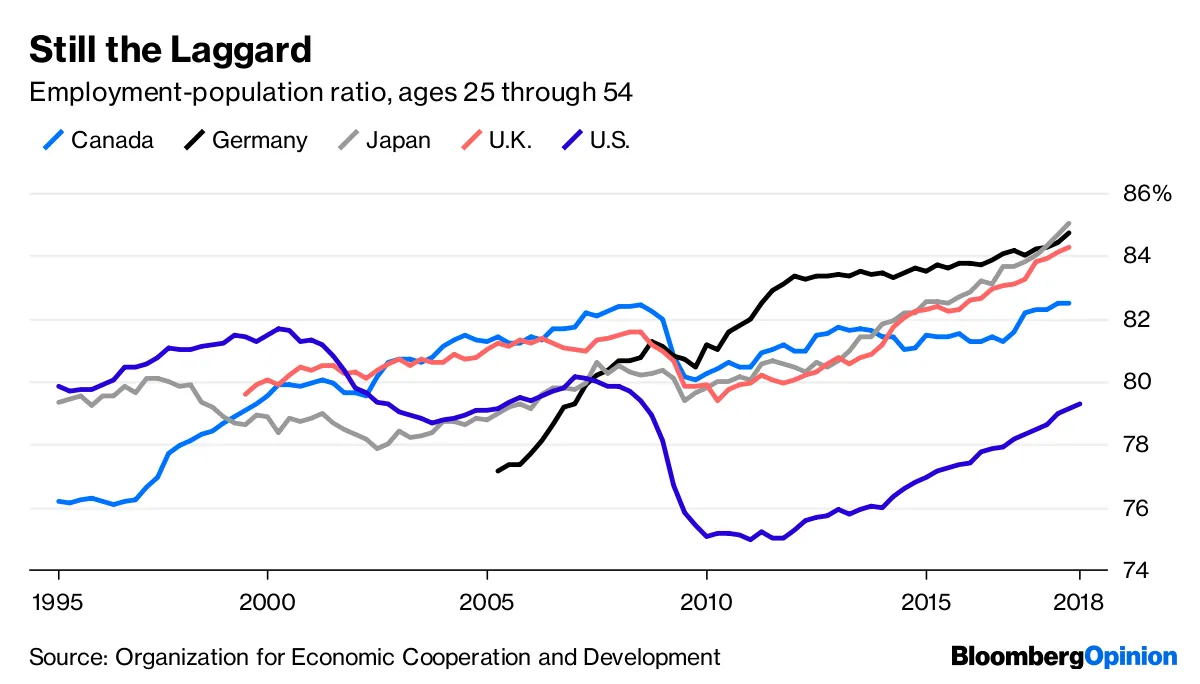 这种好消息/坏消息的动态在你深入挖掘数据时会更加明显。贾斯廷·福克斯举例指出,处于最佳工作年龄的美国人就业比例仍未恢复到经济衰退前的水平。而且仍远低于2001年经济衰退前的历史高点,并且与其他大经济体的类似比例相比,严重滞后。