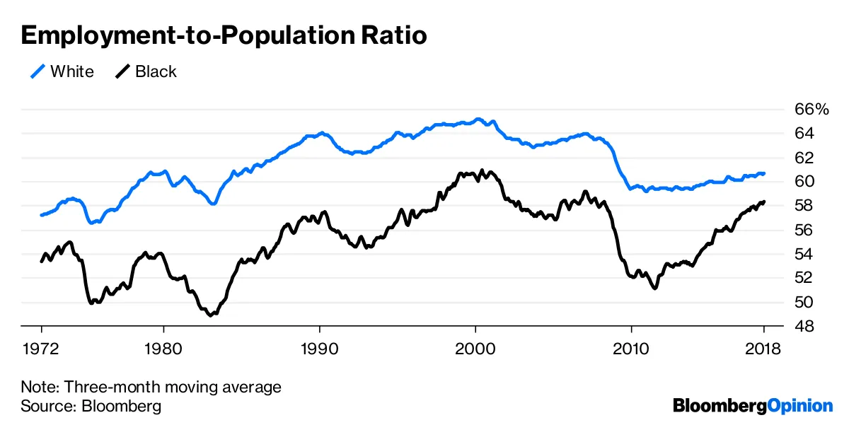 好的一面是,马克·怀特豪斯指出,拥有工作的黑人美国人的比例改善得更快,缩小了与白人工人之间曾经存在的巨大差距: