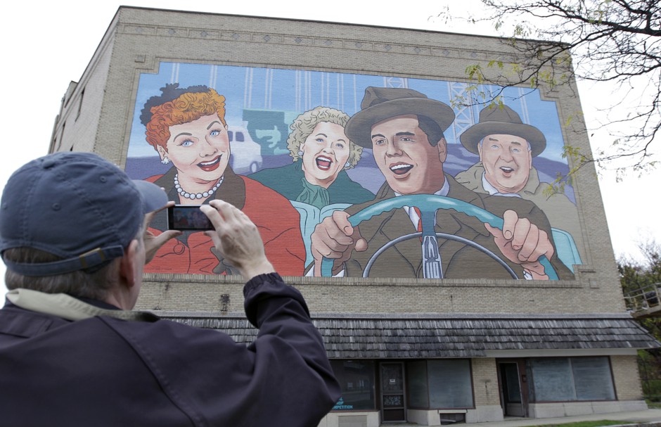 詹姆斯敦最著名的人物的壁画:露西尔·鲍尔。大卫·杜普雷/AP每年八月初,纽约的詹姆斯敦都会迎来露西的入侵。
