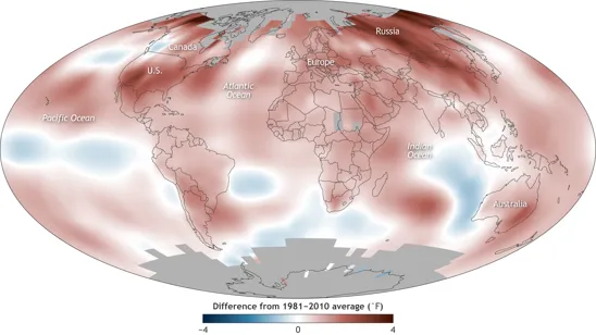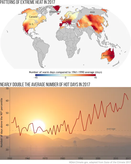 根据使用的数据集,2017年是历史上第二或第三温暖的年份,但却是有记录以来最热的非厄尔尼诺年份。全球大部分地区的陆地和海洋表面温度超过了1981–2010年的平均水平。
