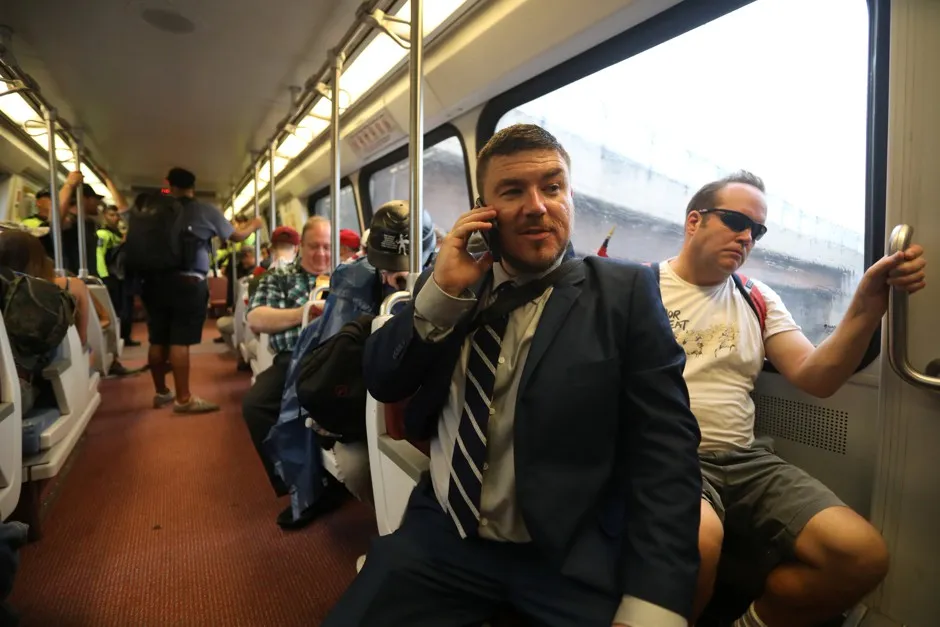 杰森·凯斯勒和他的支持者在地铁上。吉姆·乌尔克哈特/路透社在抗议现场,以及通往现场的道路上,华盛顿特区和联邦警察到处都是——骑马、骑摩托车、骑自行车和乘坐面包车;还有嗅炸药的警犬和国土安全局的官员。但他们大多限制了与抗议者的互动。反抗议团体被允许站在拉法叶公园的一侧,隔着路障和一排警察与另一侧的少数白人民族主义者分开。与波特兰或夏洛茨维尔不同,警察没有穿防暴装备。他们也没有发射橡胶子弹或喷洒催泪瓦斯,或冲入人群。