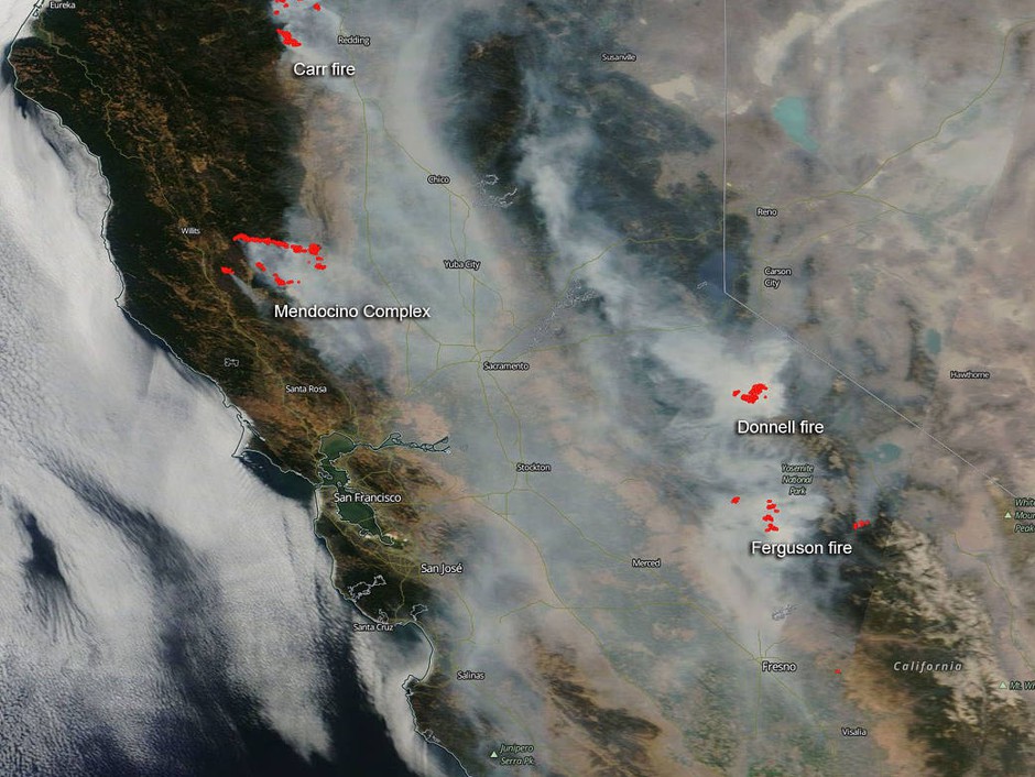 在加利福尼亚上空翱翔。美国国家航空航天局上周,美国国家航空航天局的Aqua卫星捕捉到了令人惊叹的图像(上面显示的是其中一张)显示了加利福尼亚州燃烧的几场火灾,包括位于该州北部的门多西诺综合火灾。该火灾已扩大至363,845英亩,成为加利福尼亚历史上最大的野火。目前仅控制了60%。