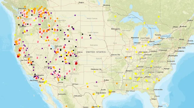 西部火灾的地图和类似地图的图像敲响了气候变化的警钟,科学家表示这正在推动极端野火季节的到来。图形还帮助消防员在偏远地区发现火灾,追踪其轮廓,并瞄准那些耀眼的灭火剂投放。国家野火协调小组从NASA和其他卫星运行机构获取数据以维护自己的火灾地图,目前这张地图主要是红色、粉色和橙色(高等级事件)环绕西部山脉的边缘。