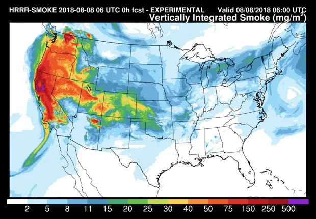 国家气象局除了展示烟雾的惊人范围外,那张地图(如上所示)上颜色的强度也突显了这些火灾消耗了多少燃料。