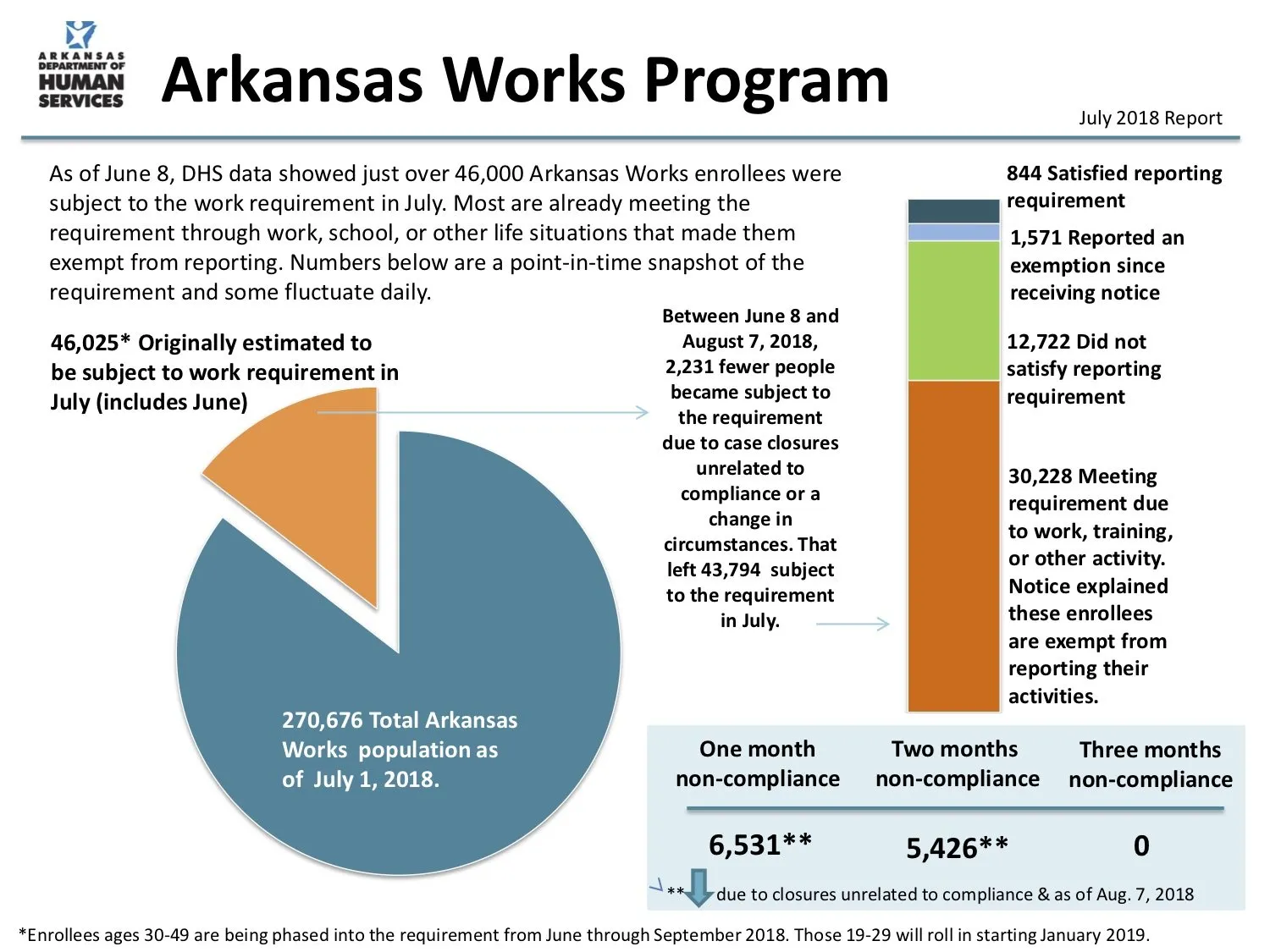 新规则正在分阶段实施,初步数据显示前两组人群已经处于危险境地。在第一个月后,大约7000人未能报告他们的工作时间。这占第一组人群的72%,而26%是阿肯色州所有医疗补助人员的比例。到第二个月,5426名第一组的缺勤者再次未能报告。自六月以来,总共有超过12000人已停止报告。如果接受者错过三个月的报告,他们将在剩下的年度中被排除在系统之外。