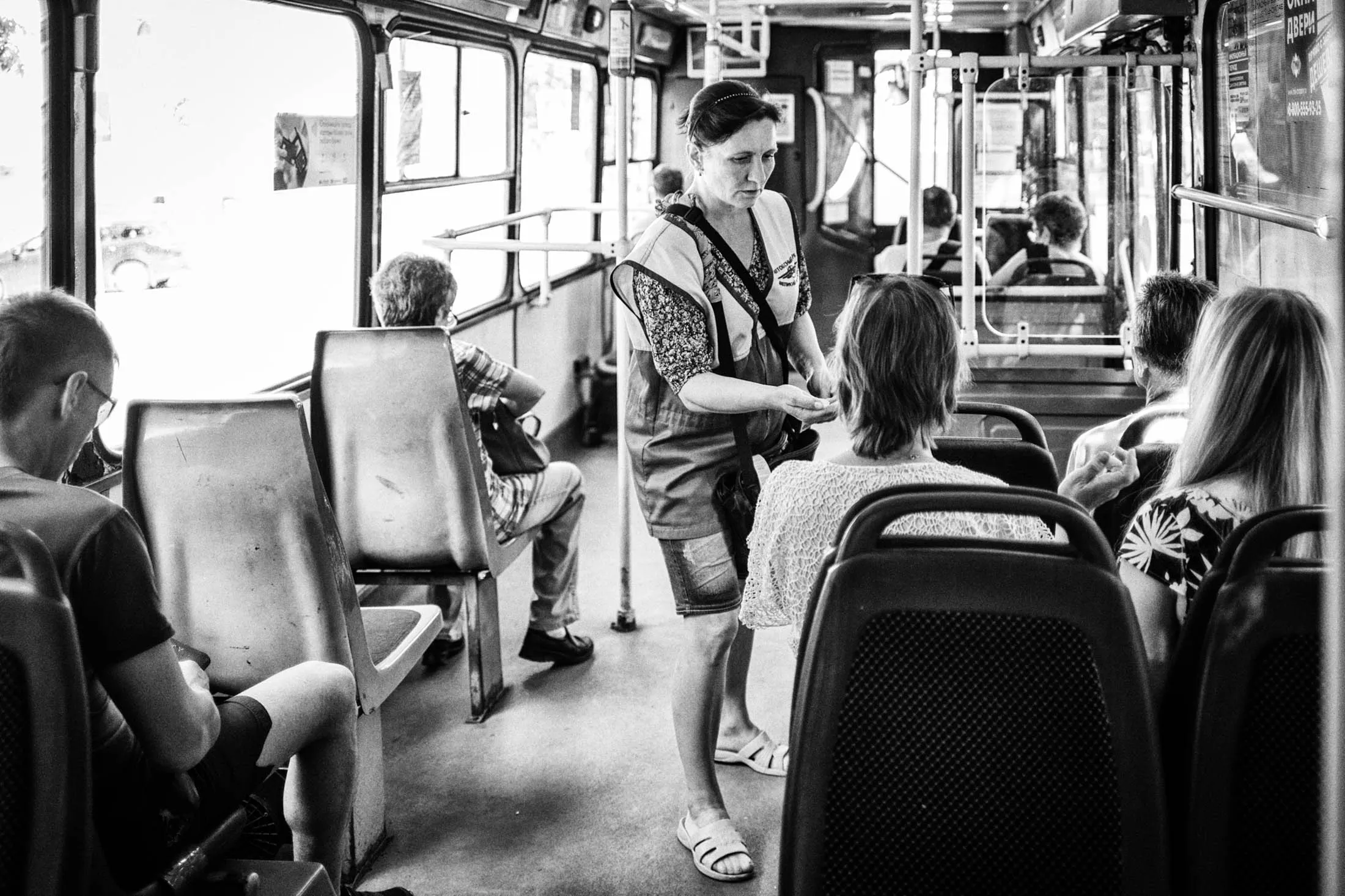 拉里萨·科瓦柳娃在诺夫哥罗德的公共汽车上收票。摄影师:米沙·弗里德曼,彭博社拉里萨·科瓦柳娃是一个面带无齿微笑的开朗女性。她称自己是“重建”的受害者,指的是米哈伊尔·戈尔巴乔夫在1980年代末期未能成功重组苏联经济的尝试。在诺夫哥罗德长大时,她刚刚完成学业并在一家国防工厂找到工作,但一切都崩溃了。工厂关闭后,她在接下来的17年里在一家化肥厂当厨师,直到2009年找到了一份公交车售票员的工作。现在47岁的她,从那时起一直在做这份工作。