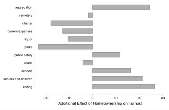 在关键政策问题上,房屋拥有权的影响甚至更大,如上图所示。不出所料,区域规划问题的影响最大,投票率大约增加75%。紧随其后的是研究所定义的所谓“聚合”问题:这些是关于社区是否应该集体协商公共事业(如电力)的费率的投票。房主在与公共安全、学校、儿童和老年人相关的措施上也更有可能参与投票。