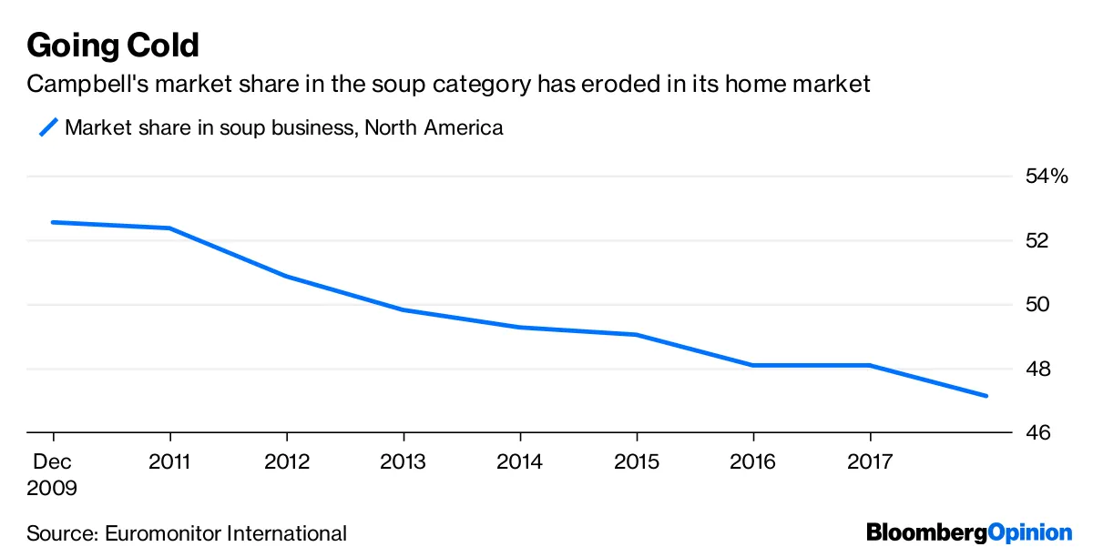 坎贝尔汤公司对未来有一些好的计划,但目前似乎没有一个能解决这个令人不快的图表,写道莎拉·哈尔扎克: