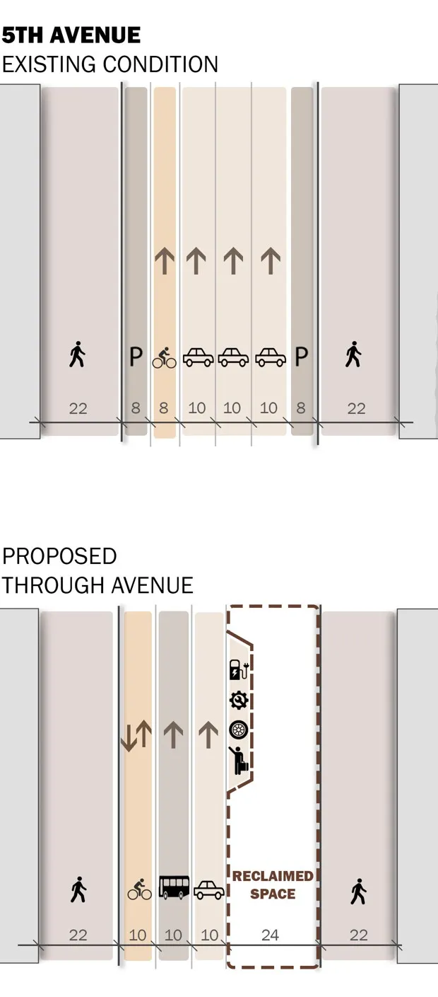 所有元素结合在一起——专用的汽车和公交车道、自行车道以及适合行人的空间——占用的空间比现有布局要少。大道将回收24英尺;更宽的街道回收16英尺;而狭窄的街道回收8英尺。在回收的空间中,可以提供新的设施,例如快闪商店、餐饮场所或灵活的工作空间。回收的街道空间还可以容纳充电站、送货或出租车和共享乘车的上下车点。