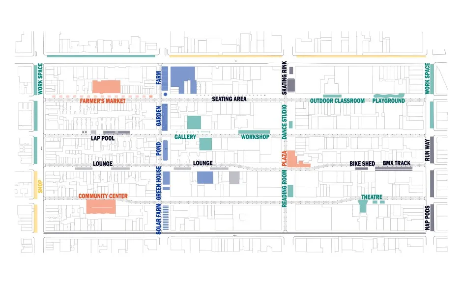 该区域大多被划为混合用途的中层商业和住宅用途。它的密度很高,明显缺乏公共空间:在其边界内没有广场、公园或其他绿地。居民将从这里增加的公共空间中受益——特别是灵活的户外空间。当地学校可以拥有户外教学空间,并将其用于社区参与。