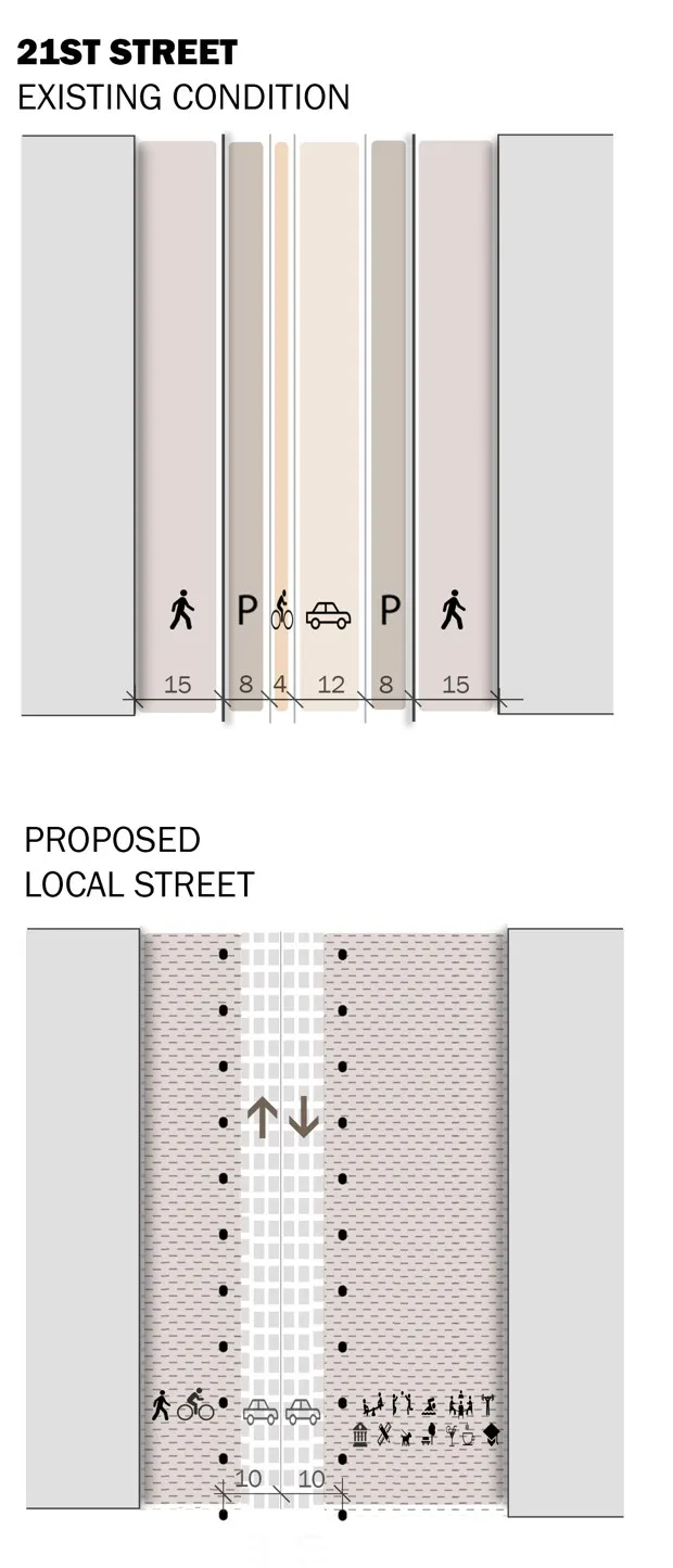 地方街道将经历更为剧烈的转变。它们将没有路缘;汽车车道将抬高几英寸,与原始路缘的高度相平,以形成一个平坦的表面(仅在需要排水时倾斜)。车辆和行人将共享空间,类似于一个woonerf。