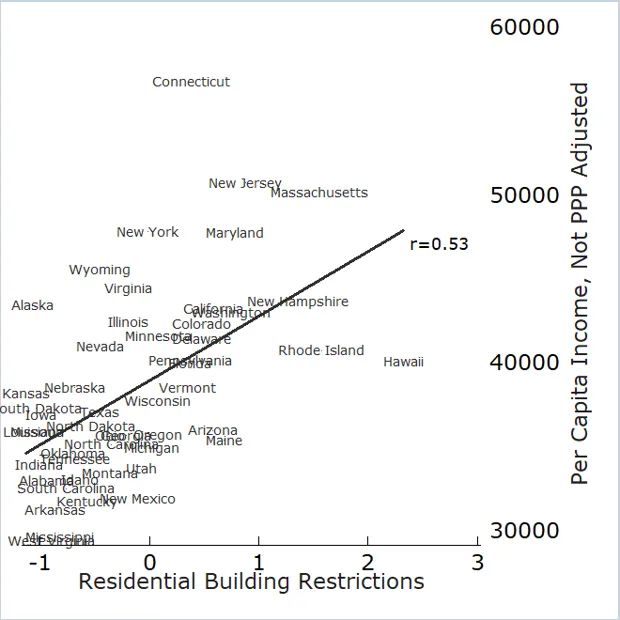 一张美国各州的散点图,说明住宅建筑限制与人均收入之间的正相关关系。杰森·索伦斯通过观察1984年至2016年间各州的总统投票模式,索伦斯发现更严格的地方随着时间的推移倾向于民主党,这一现象在控制其他因素后依然明显。住房限制的增加及相关的住房成本上升导致在随后的四年中民主党投票份额的上升。