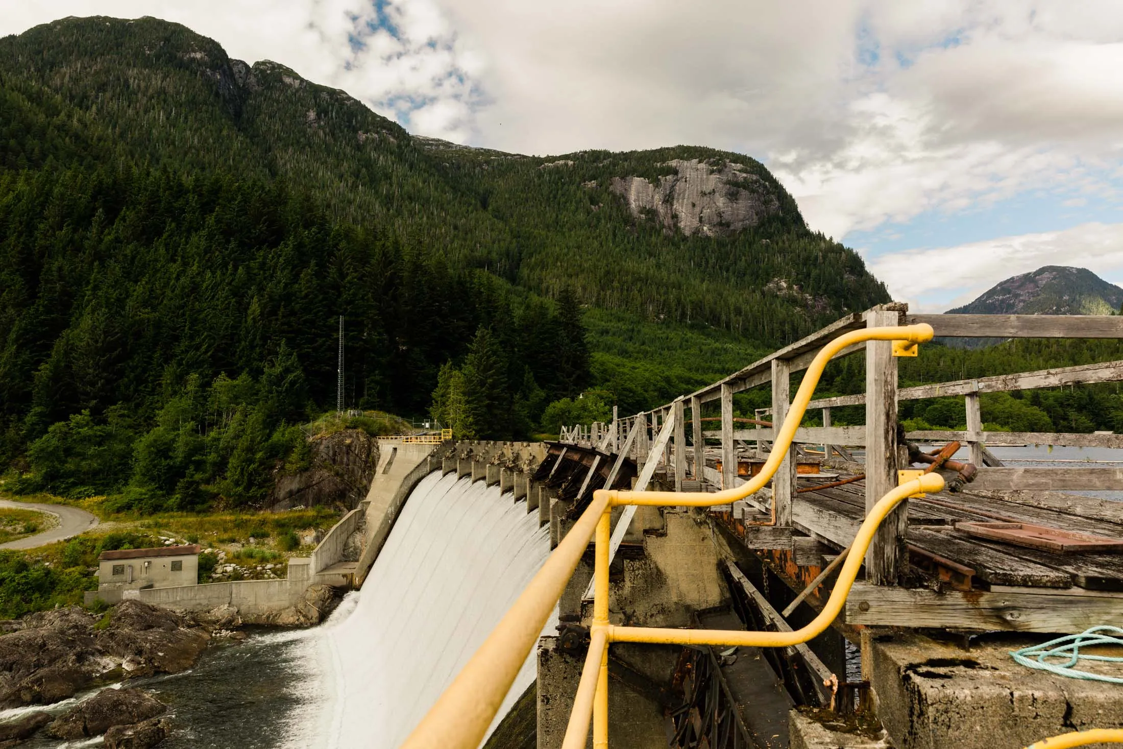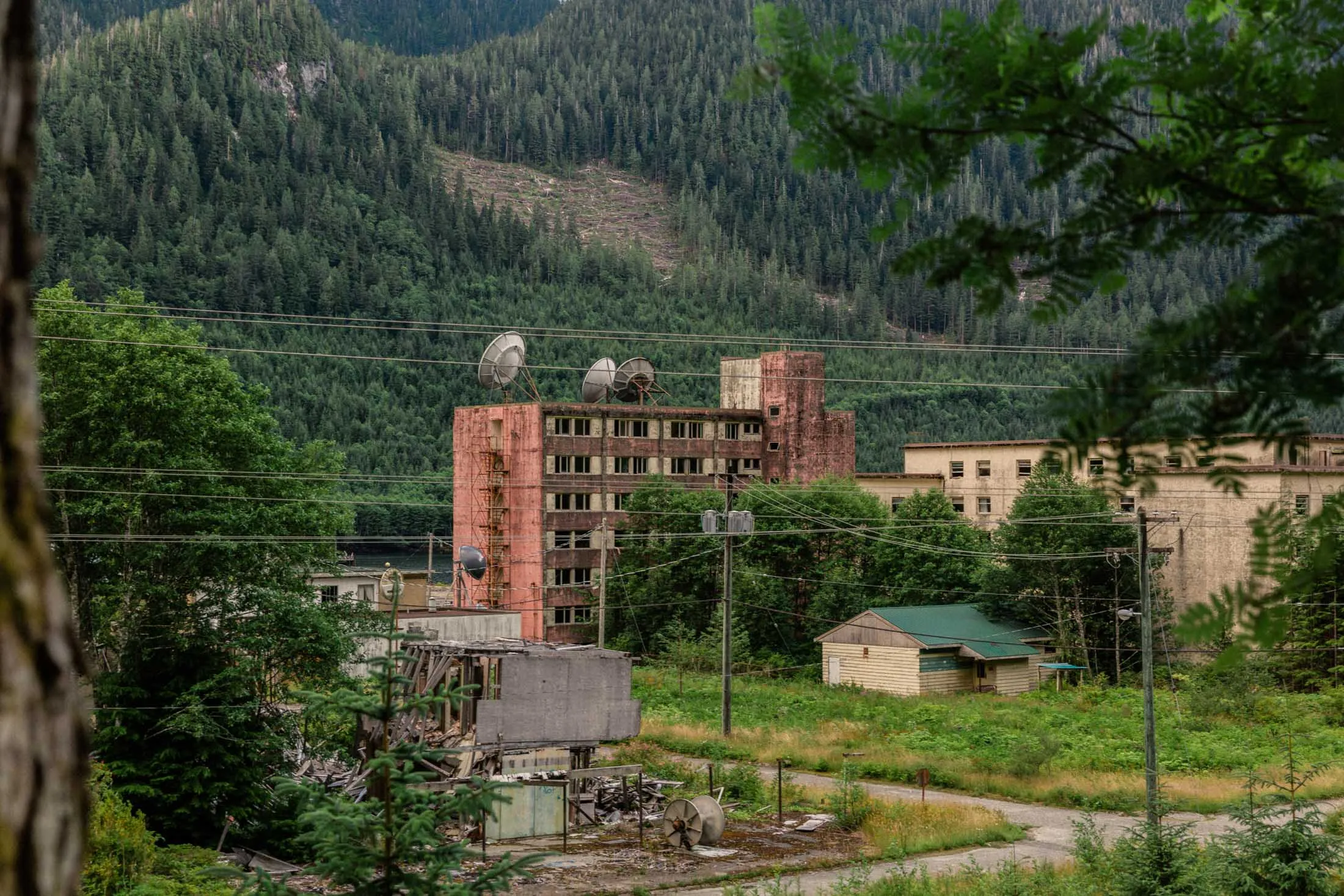 这座工厂建筑是曾经庞大工业综合体中仅存的少数结构之一。摄影师:杰基·戴维斯,彭博社海洋瀑布隐藏在不列颠哥伦比亚省海岸线的壮丽景色中。陡峭的山脉被松树林覆盖,从宽阔的水道流入太平洋。乘船前往海洋瀑布的过程中,唯一的人类存在迹象是一条从大坝延伸出来的电力线。当游客接近码头时,他们看到的第一件事就是一座大型废弃酒店。屋顶部分坍塌,但这座建筑的状况仍然比对面街道上的建筑要好。旧工厂综合体在一个锁着的门后向右延伸,而大坝则需要步行十分钟上山。沿着那段路的建筑状况逐渐恶化,很快,大多数地块上只有高高的杂草。大多数居民住在一条紧贴海岸的道路上,远离破败的前市中心。唯一真正的公共商业是一个酒吧,萨戈酒馆,周一、周三和周五下午4点到7点营业。