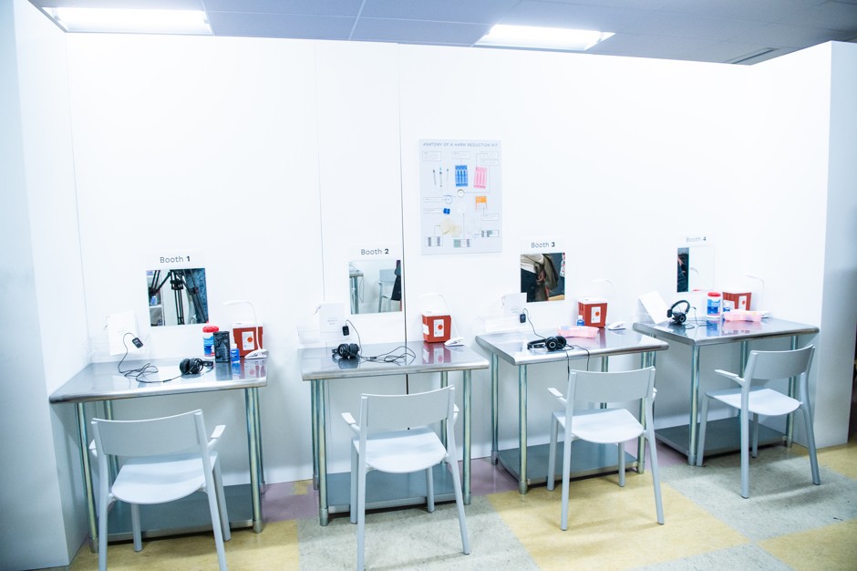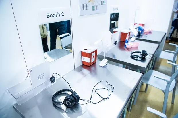 在旧金山的模拟安全注射点,使用者通过耳机听取瘾君子的故事。阿兰·麦克劳林/安全内部为了指导旧金山模拟设施的规划,首席设计师珍妮·肯普森访问了温哥华的场所,并与旧金山药物使用者联盟的成员进行了交谈,该联盟倡导大约22,500名城市药物使用者的权利。根据他们的反馈,该地点要求每个摊位之间留有足够的空间,以便在有人过量时,有足够的空间安全处理。该空间还拥有许多平坦的表面——这对无家可归的使用者尤其重要,他们“在公园或人行道上根本没有空间去整理自己的东西或坐得舒适,”肯普森说。