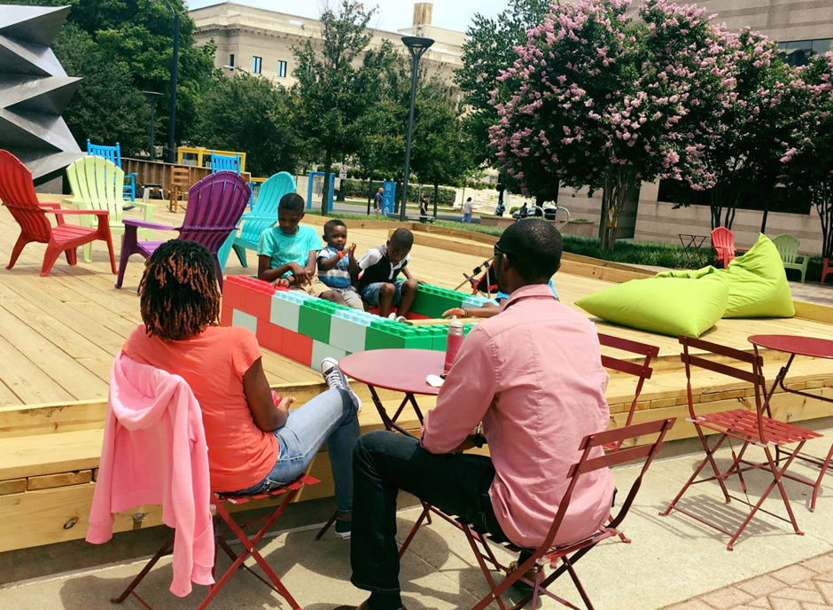 设计安装前的政府广场。活跃设计中心夏洛特市决定试一试。在2017年,借助外部资助,夏洛特的广场暂时转变为“GovPorch”—一个欢迎的政府建筑“前廊”,设有公共艺术、甲板椅和豆袋座椅。每周五,它都会通过现场音乐和餐车进行激活。