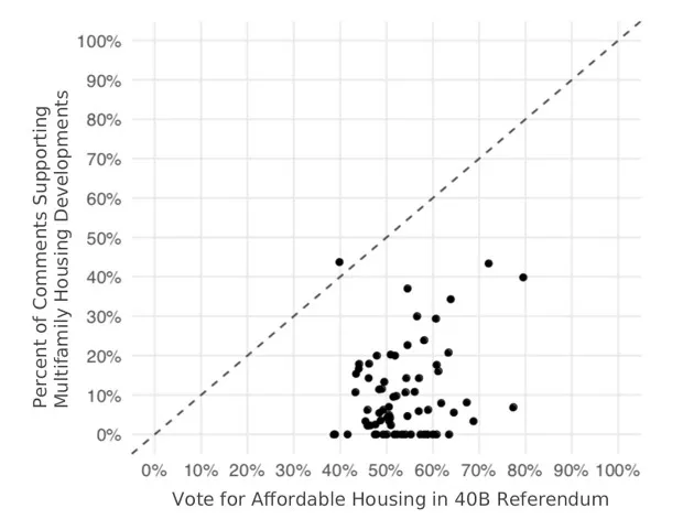 在研究中的城市和城镇中,56%的选民反对废除并支持第40B章,这与全州58%的数据一致。与此形成对比的是,支持任何类型新住房建设的会议参与者不到15%。