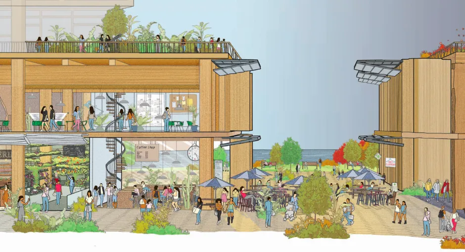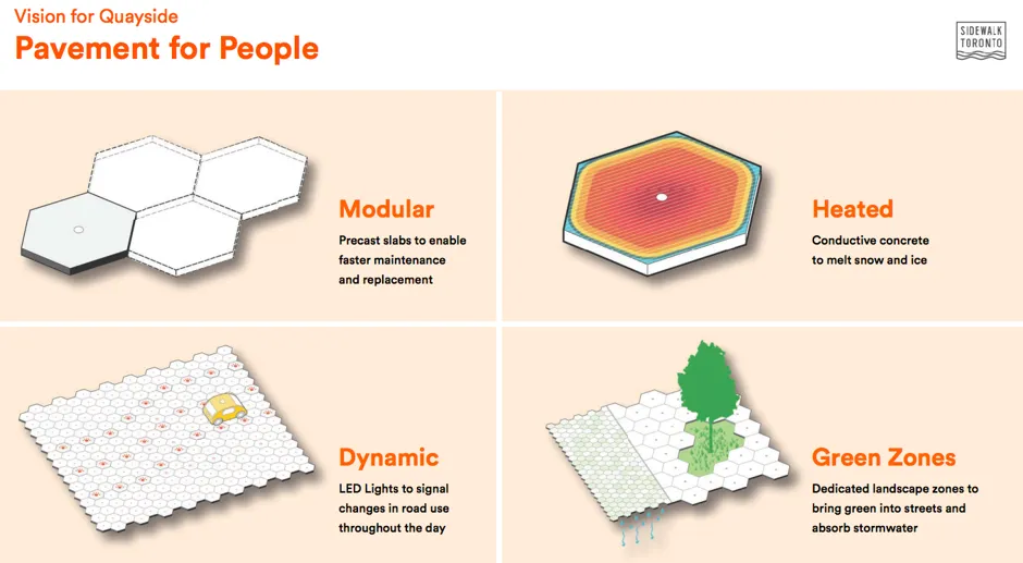 幻灯片展示了一个迷人的城市场景,充满了有机形态的户外空间,绿意盎然的棕榈叶和多层户外露台。人行道实验室的代表解释说,码头区的多层建筑将采用复合木材,这种建筑风格因其较低的环境影响和美学温暖而受到推崇。建筑将由零排放微电网供电,模块化设计,设有小型私人单元和适应不同用途的全年公共空间。在街道上,行人和骑自行车的人将获得最高优先权,周围是共享的低速自动驾驶车辆。能够融化雪、吸收雨水并用LED灯引导交通的瓷砖将构成脚下的铺面。