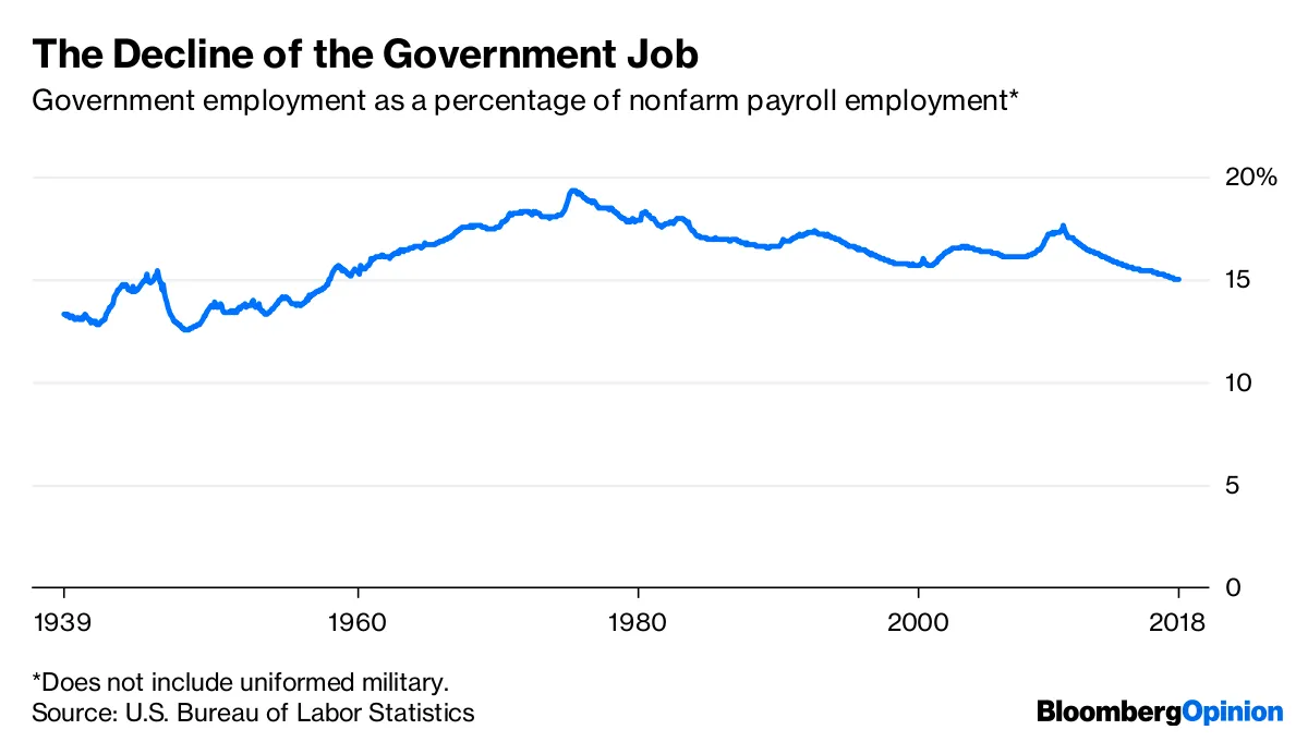政府在就业市场的份额是几代人以来最低的,贾斯廷·福克斯写道。