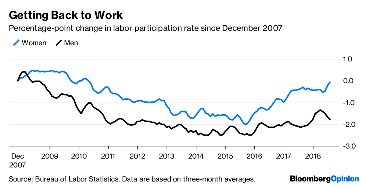 女性在强劲增长和低通胀的“金发姑娘”经济中扮演着关键角色,马克·怀特豪斯写道。这是因为她们正在迅速重返劳动力市场,帮助增加劳动力供应并保持其价格低廉。