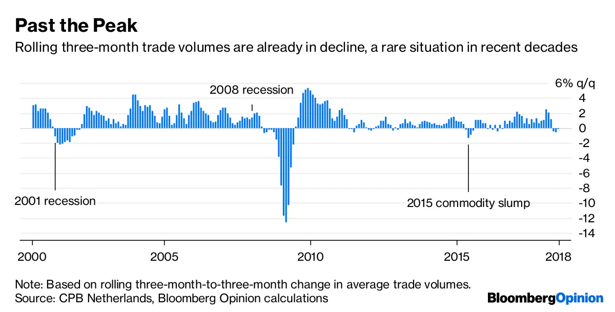 特朗普政府正在对中国进口商品拟定2000亿美元的关税进行最后的修订。你知道这意味着什么:是时候再加更多关税了!唐纳德·特朗普总统今天表示,他可能会对另外2670亿美元的中国进口商品征收关税。总的来说,目前和威胁中的关税将 超过 中国目前对美国的出口,但谁在乎呢?无论如何,市场似乎对影响大多不以为然,许多投资者认为这只是理论上的、遥远的事情。但 全球贸易已经放缓,大卫·菲克林指出;事实上,我们正处于自经济衰退以来仅有的第二次持续贸易下滑之中: