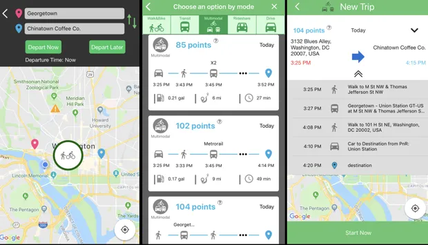 这款名为Incentrip的应用程序是由能源部资助的450万美元研究项目的一部分,旨在预测交通并缓解拥堵。目前在华盛顿特区和巴尔的摩进行试点,它基本上将通勤体验变成了一场游戏。当用户在应用程序中输入目的地时,他们会看到几种选择——汽车、公交、地铁、骑自行车和拼车——并提供每种方式的长度、时间和燃料消耗量的信息。