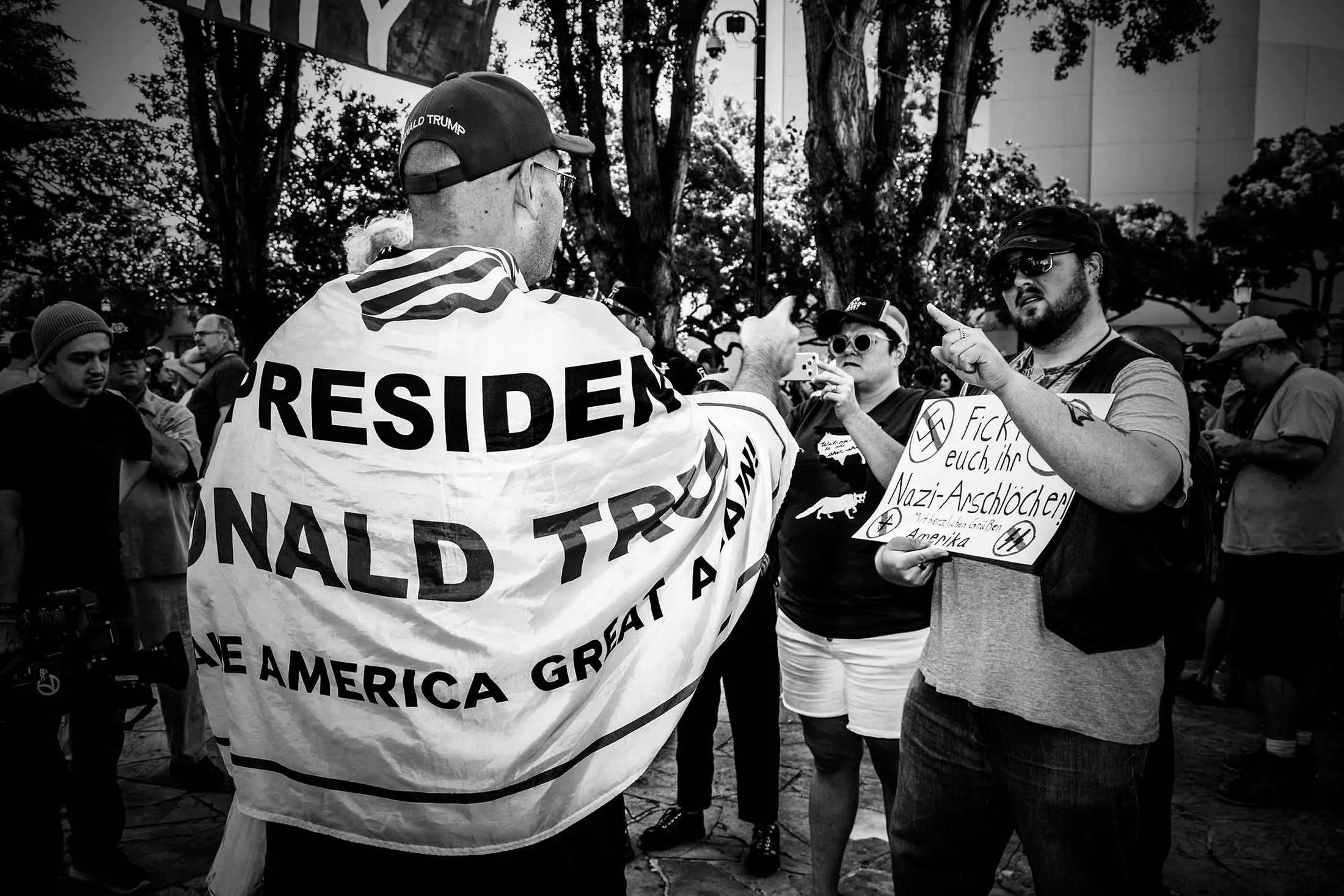 一次计划中的“反对马克思主义”集会吸引了特朗普/白人至上主义者/另类右派的支持者,他们出现在加利福尼亚州伯克利,面对“伯克利团结反对仇恨”的支持者、黑衣示威者和反法西斯主义者,时间是2017年8月27日。