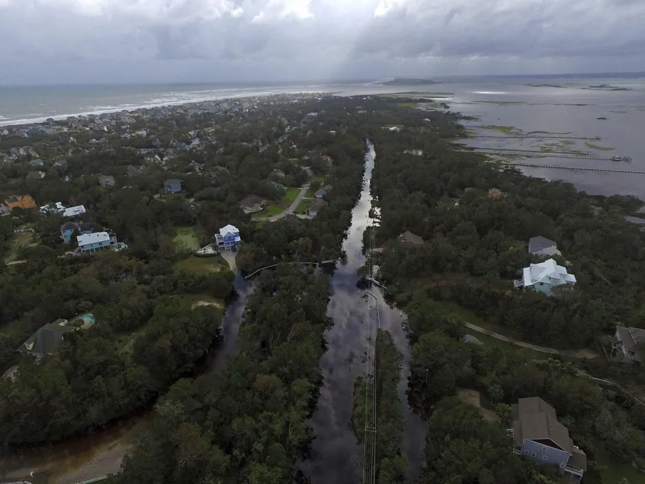 通往北卡罗来纳州翡翠岛南端的海岸警卫队道路。汤姆·科普兰/AP单行道设计用来排水洪水的方式是将其抬高于周围的地形。因此,当洪水覆盖高速公路的大部分区域时,该地区的水位比从道路上看起来的要高出几英寸或几英尺。