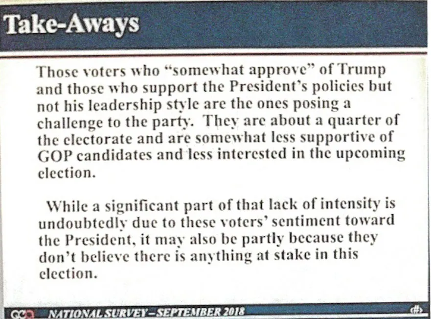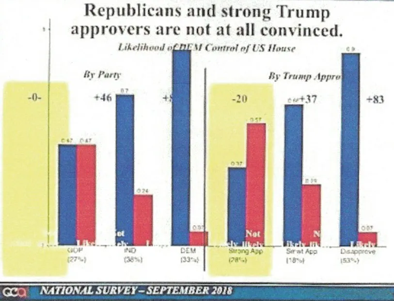 内部的RNC研究发现,共和党选民的自满情绪与他们对总统的信任直接相关——以及他们对传统民调的不信任。“虽然这种缺乏热情的很大一部分无疑是由于这些选民对总统的情感,但也可能部分是因为他们不相信这次选举有任何风险,”作者写道。“简单来说,他们不相信民主党会赢得众议院。(他们为什么要相信那些告诉他们希拉里会当选总统的预言家呢?)”