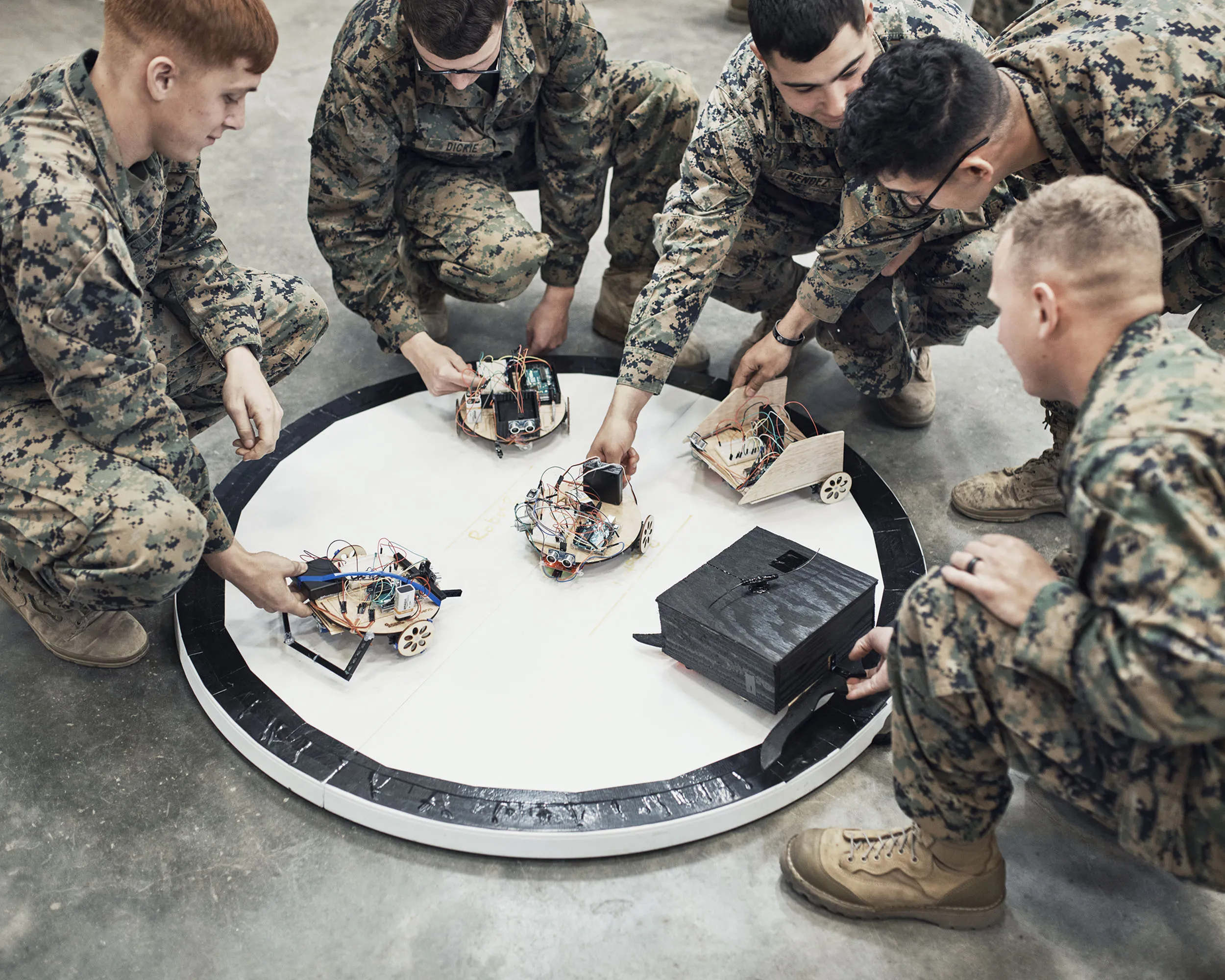 坎普·彭德尔顿的海军陆战队员被给予两个小时的时间,将一堆金属——主要是圆形和方形的条,外加脚轮和轮子——变成一个Halsey称之为“城市独木舟”的粗糙车辆。它必须容纳一个团队的四名成员,并且必须在不让手或脚接触地面的情况下进行动力和操控。(他们必须焊接“桨”以便在场地上“划船”——也就是推动自己前进。即使是获胜团队,进展也很缓慢。)后来,他们被给予一个下午和第二天早上,用木材、主板和传感器建造一个战斗机器人。