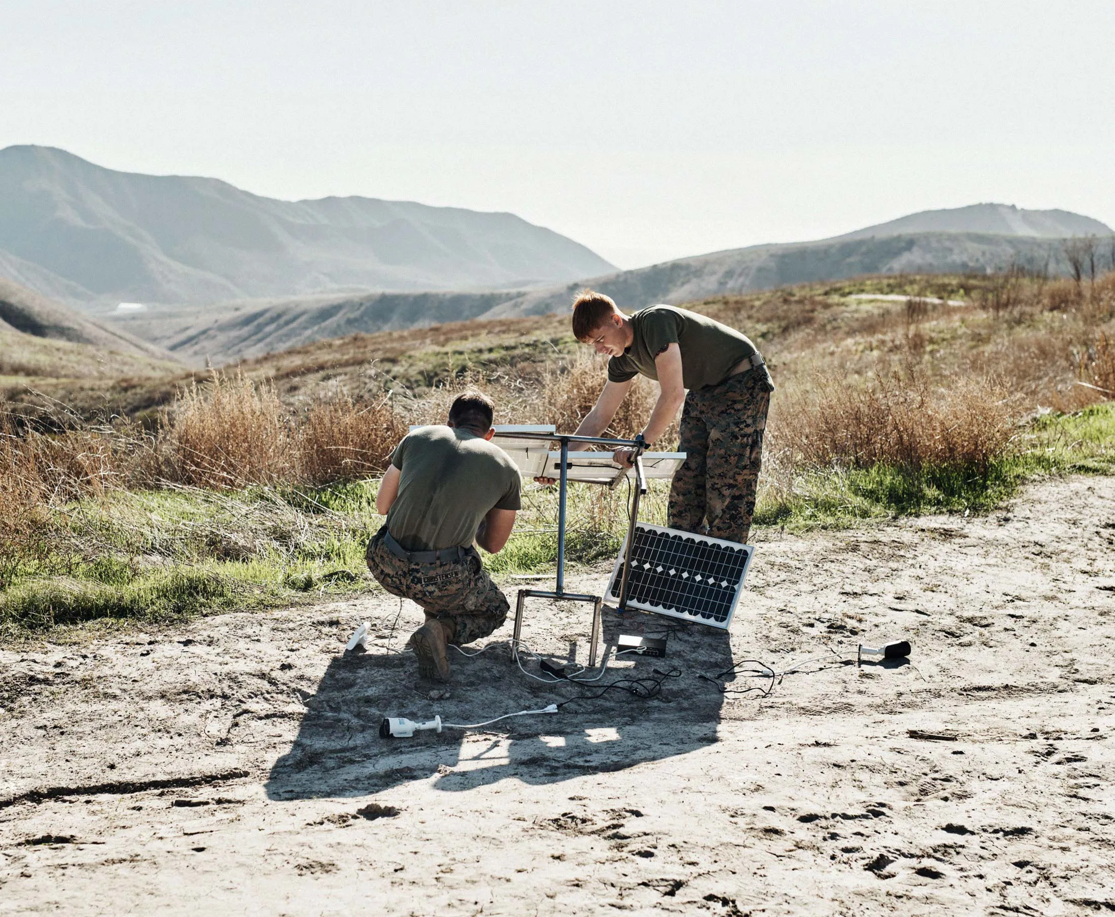 一对海军陆战队员构建了一个太阳能监视系统。摄影师:托马斯·普赖尔,彭博商业周刊当他回到家时,Exponent让他负责招聘和准备更多科学家加入快速装备部队。这是一个启示。“我发现斯坦福和麻省理工学院的大多数博士不喜欢在舒适区之外工作,”他说。他们在各自的专业领域非常出色,但在执行方面却不那么擅长——将想法转化为实际事物。哈尔西创建了一个地狱周,以筛选那些在战场上无法实际贡献的科学家和工程师,并最终意识到这其中有商业机会。于是,Building Momentum开始了。