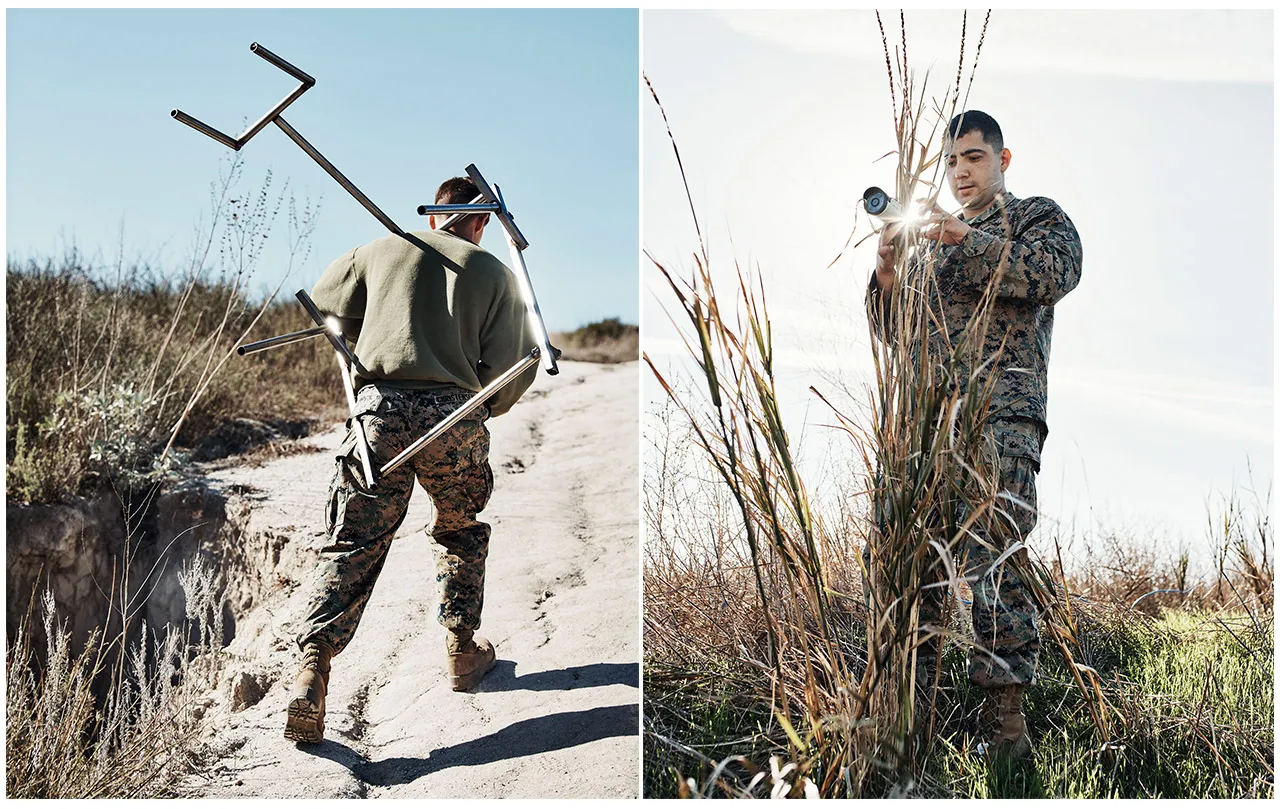 左:一名海军陆战队员搬运焊接好的太阳能监视系统框架。它是用城市独木舟的废料制成的。右:另一名海军陆战队员设置远程摄像机,将其固定在芦苇上。摄影师:托马斯·普赖尔为《彭博商业周刊》拍摄孤独的军士,一个来自犹他州的有胡子的机动池机械师,负责指挥并根据每个人最舒适的任务分配职责。他们设置了快速监视系统,并在周五早上返回,发现录像带引导他们找到一个隐藏的SD存储卡,里面包含即将发生攻击的细节。