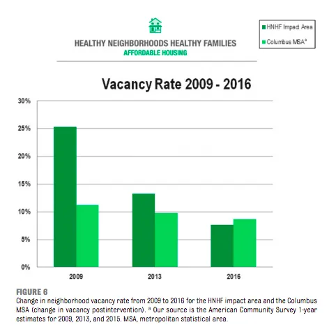 由于全国儿童医院在南果园推动的重建,该社区的住房空置率现在低于城市的水平。高中毕业率有所提高,报告的凶杀案在该地区有所下降,与城市其他地区的趋势形成对比。根据研究,这些因素应该加起来形成一个“更健康”的社区,孩子们就医的频率降低。