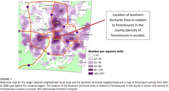 新兴的医学研究表明,环境如何决定健康:生活在贫困和犯罪根深蒂固的社区中的压力会增加一个人受伤、心脏病、糖尿病、中风、癌症和呼吸系统疾病的风险。哥伦布南区的儿童在肥胖和哮喘方面遭受不成比例的影响;婴儿死亡率是全州最高的之一。