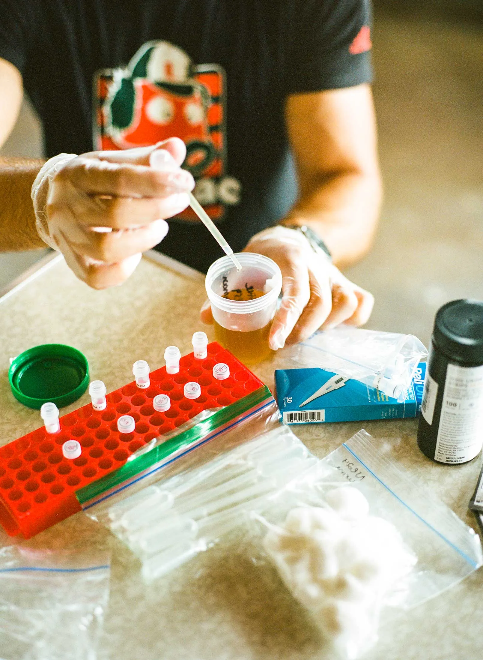 麦克和她的两名研究助理跟随凯萨达进入他的家,他们让他坐下,测量他的血压、心率和体温,并指示他提供尿样。他们还抽了他的血,将试管放入便携式分析仪中。“我们处理它,”麦克说,“基本上就像你在医院或实验室里做的那样,然后我们立即将其放在干冰上以保存,并带回学校进行分析。”