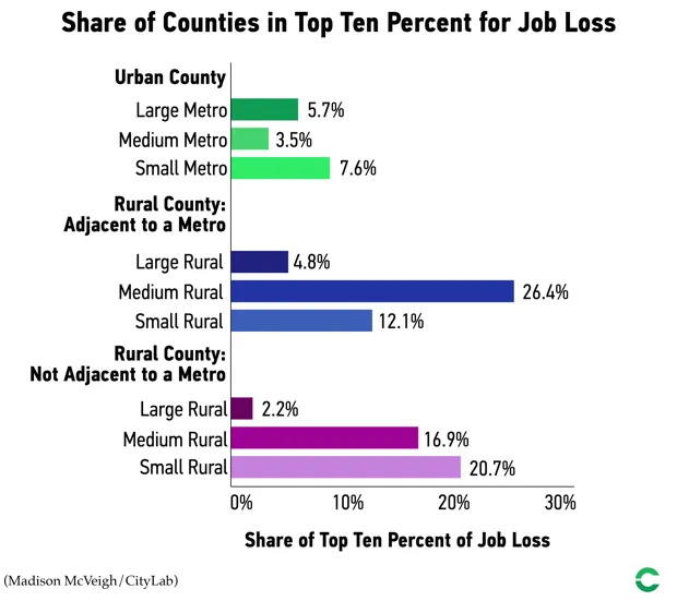 但是,查看平均或中位数增长率可能会产生误导。它可能掩盖了经历就业增长或下降的地方的分布。下面的图表显示了每种类型县在就业增长中排名前10%的比例。
