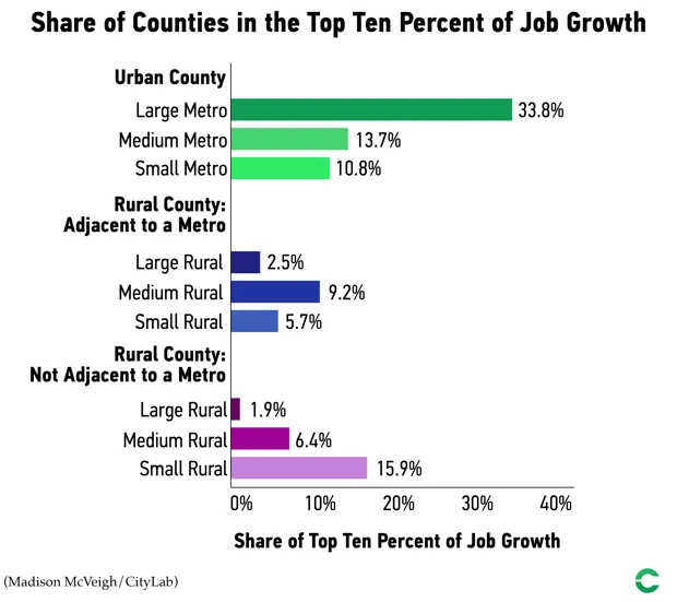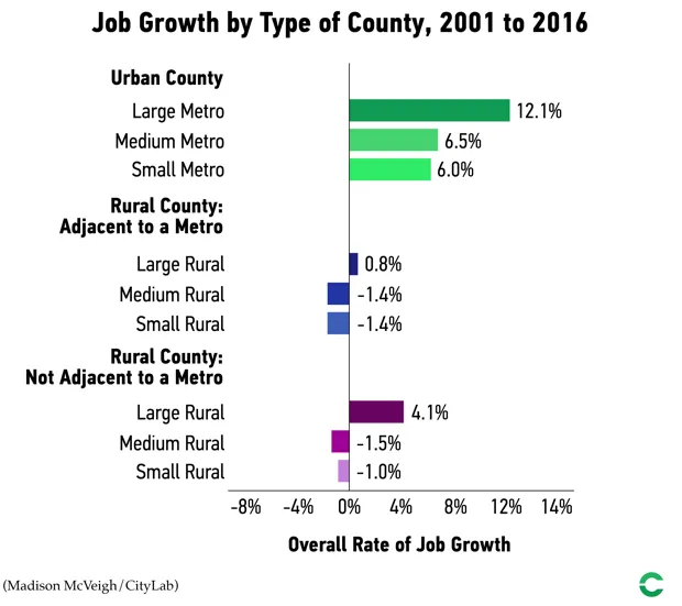 不仅如此:城市县的就业增长率远远超过农村县。在全国范围内,过去十五年所有县的中位数就业增长率为2.1%。大型城市县的就业增长率为12%,而小型和中型城市县的增长率为6%。大多数类型的农村县经历了负就业增长,只有大型农村县报告了正增长率:位于城市地区外的大型农村县的就业增长率略高于4%,与小型和中型城市县的就业增长率相差不远。