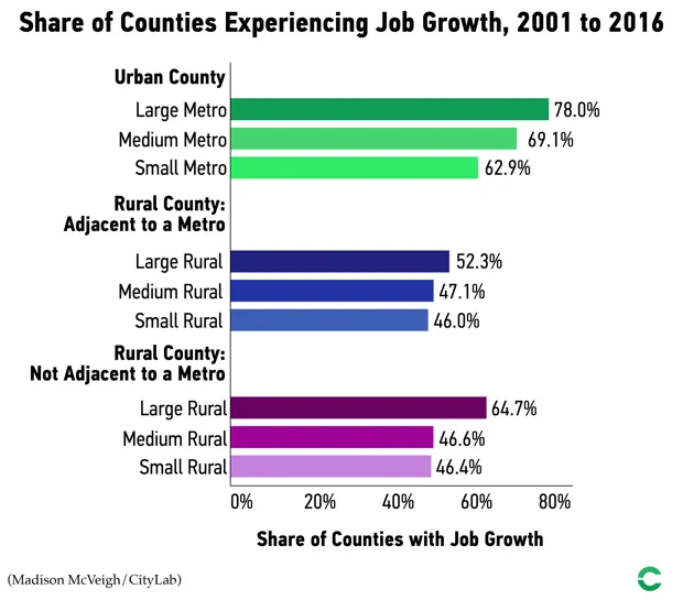 在全国范围内,2001年至2016年间,超过一半的县实现了就业增长。在城市县中,拥有就业增长的县的比例明显更高:近80%的大型城市县经历了就业增长;近70%的中型城市县,约63%的小型城市县也实现了就业增长。与中型和小型城市县相比,非城市邻近的大型农村县在此期间约有65%实现了增长。