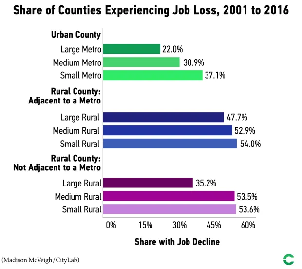 就业损失反映了与就业增长相同的基本模式。在全国范围内,44%的县在2001年至2016年间经历了就业损失。但只有22%的大型城市县经历了就业损失——仅为全国平均水平的一半。大多数类型的农村县的就业损失超过了全国平均水平,其中50%或更多的这些县出现了就业损失。在这里,远离主要城市的大型农村县的就业损失率也表现得更好——与小型和中型城市地区相当。