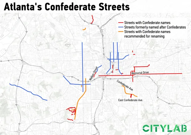 多年来,亚特兰大已更改了七条纪念三K党和南方联盟领导者的街道名称——但仍有数十条街道保留着这样的名称关联。亚特兰大人长期以来一直在争论该如何处理这些问题,但去年的夏洛茨维尔极右集会促使当地领导层最终采取行动。该市于2017年8月成立了南方联盟纪念碑顾问委员会,以探索处理遍布市政景观的失落事业名称的方式。该工作组确定了六个纪念碑和大约30个街道名称,这些名称可能很快会被砍掉。