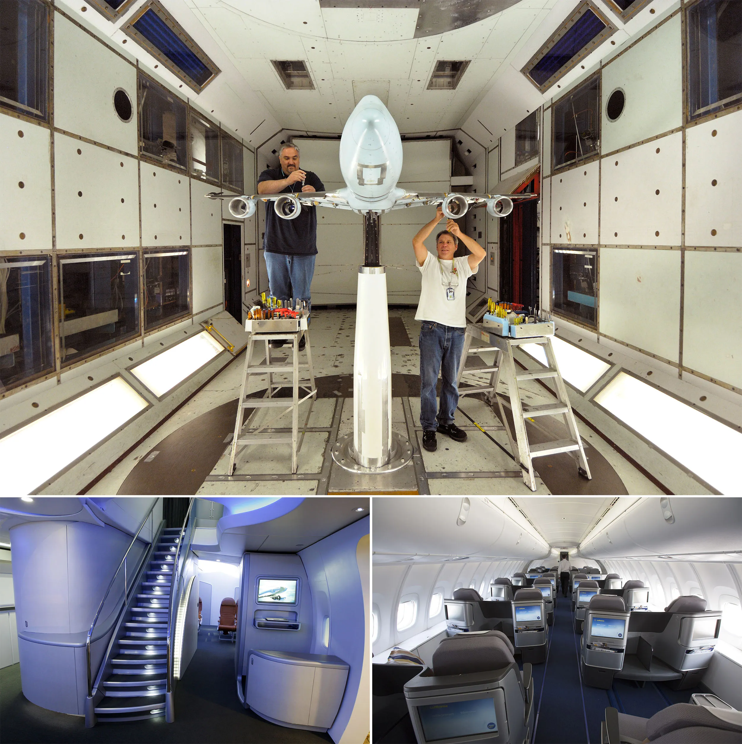 摄影师:aviation-images.com/UIG 通过 Getty Images,Martin Leissl/Bloomberg,Kevin P. Casey/Bloomberg波音最新版本的喷气机747-8,在汉莎航空和Sutter的推动下进行了发动机大修和新机翼的改造,尽管退休,Sutter仍在90多岁时担任波音顾问。这次升级成本高昂,因为设计变更和由于梦幻客机延误造成的工程短缺使747的进度落后多年。顶部,2006年的风洞测试。左下,2011年在华盛顿州Renton的波音客户体验中心展示的波音747-8上层舱的楼梯。右下,2014年汉莎航空的747-8商务舱。