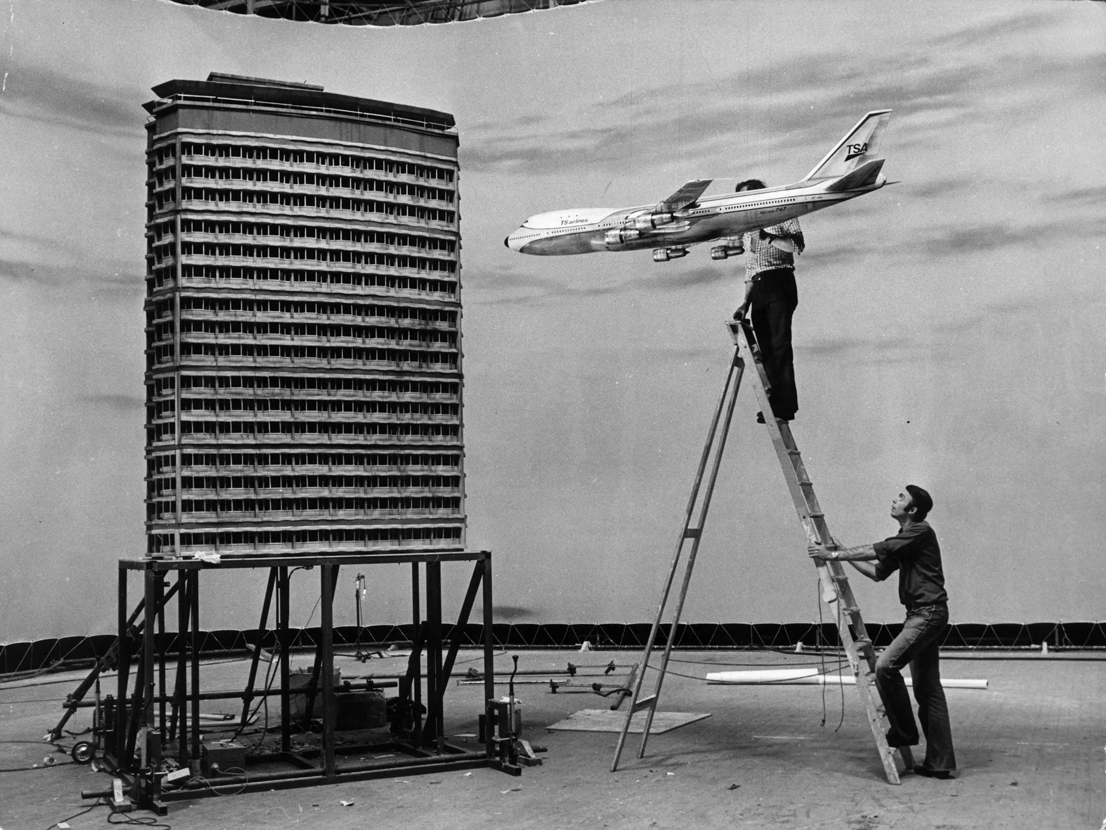 摄影师:Alan F. Davis/Keystone 通过 Getty Images1977年8月9日,派恩伍德制片厂的电影技术人员为杰克·戈德的电影《美杜莎之触》搭建了一个迷你空难场景,使用了波音747和摩天大楼的缩放模型。