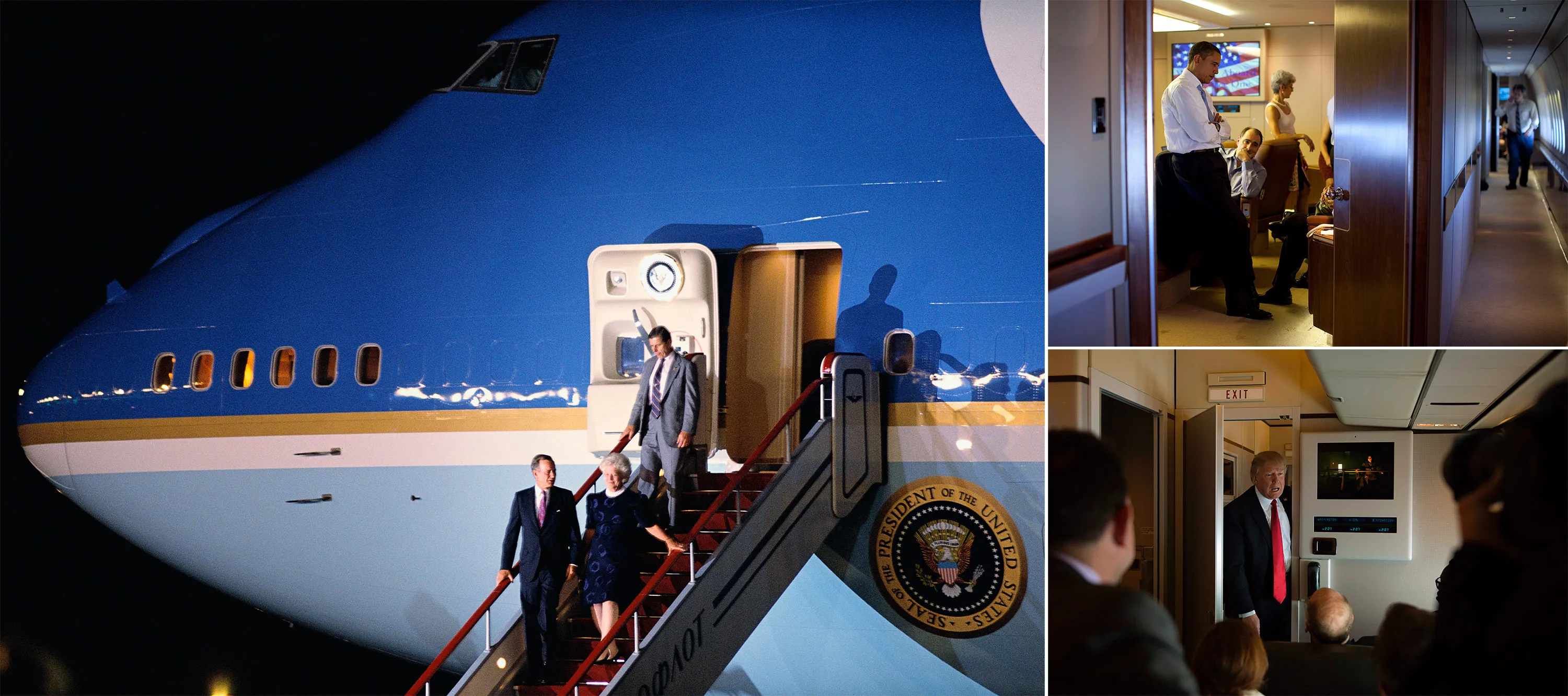 摄影师:Shepard Sherbell/Corbis 通过 Getty Images,Pete Souza/白宫 通过 Getty Images,Jim Watson/法新社 通过 Getty Images不仅仅是NASA选择747来运输贵重货物。在1980年代中期,里根政府订购了两架747,以替换用于运输美国总统的老旧707。乔治·H·W·布什(左,1991年与妻子芭芭拉在莫斯科下飞机)是第一位受益于新空军一号的总统。右上,巴拉克·奥巴马在2009年11月与助手在空军一号上商讨。右下,唐纳德·特朗普在2017年4月的飞机上与媒体交谈。