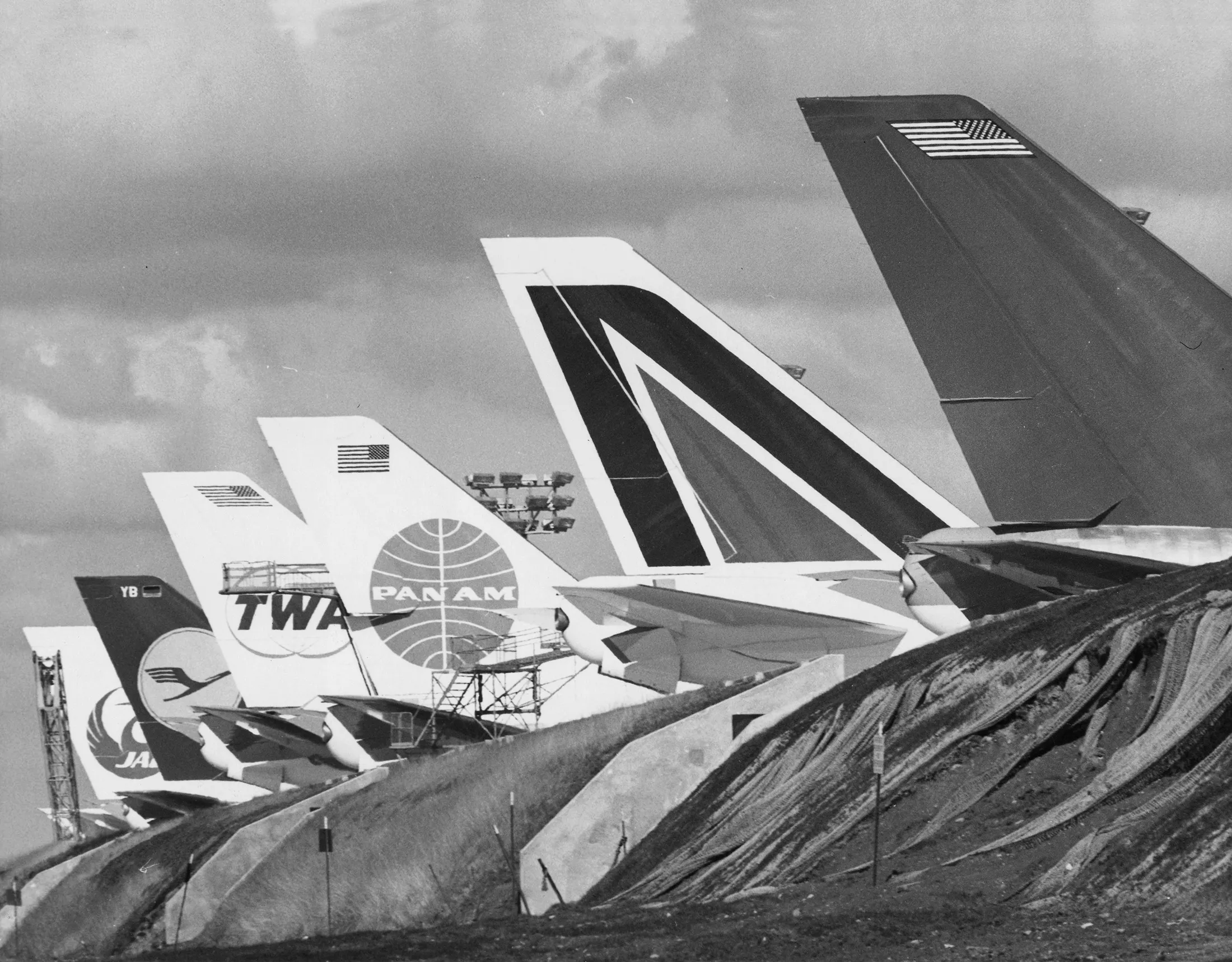 来源:Mondadori Portfolio 通过 Getty Images1970年,六个新的波音747尾翼在波音埃弗雷特工厂的堤岸上展示,等待交付给各自的航空公司。