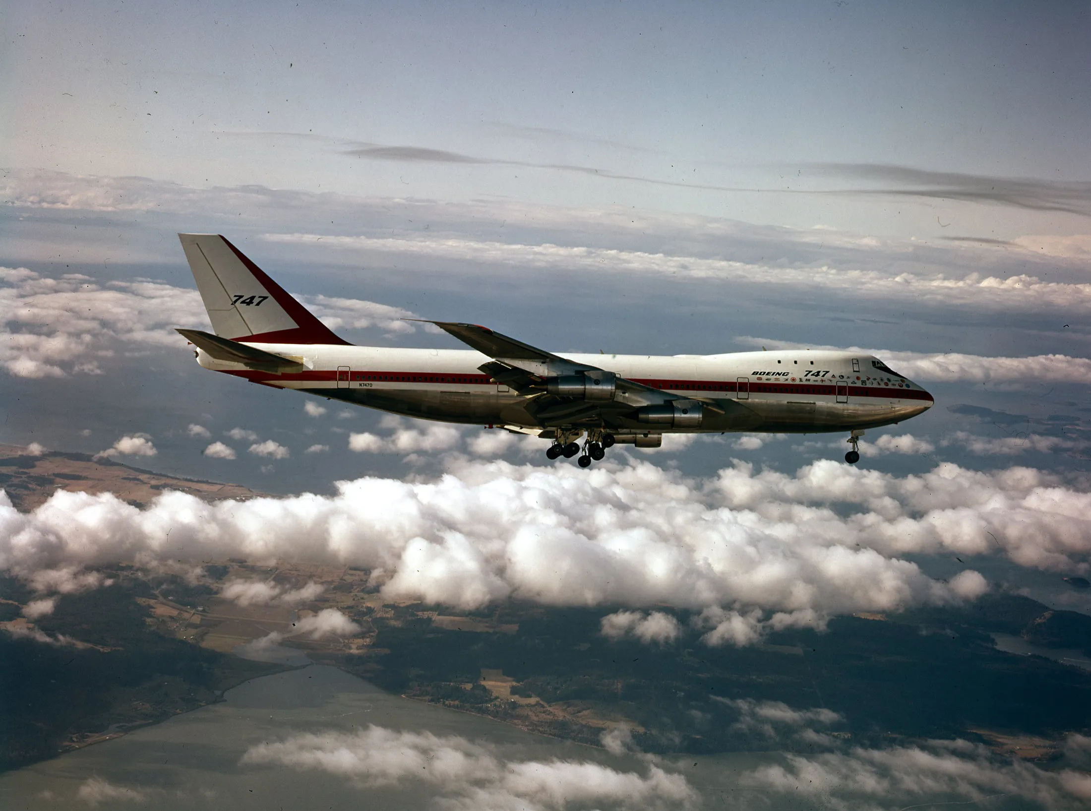 这里的747在华盛顿州的普吉特海湾上空。来源:波音
