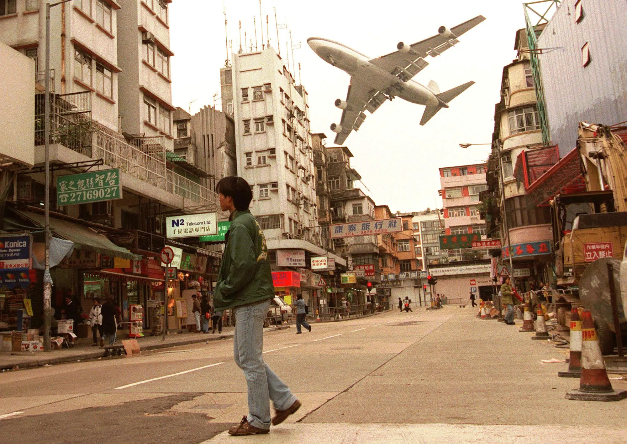 摄影师:Vincent Yu/AP Photo一名行人在九龙的道路上穿过,正好在香港启德国际机场的飞行路径下,一架波音 747 准备于 1998 年 3 月 3 日降落。