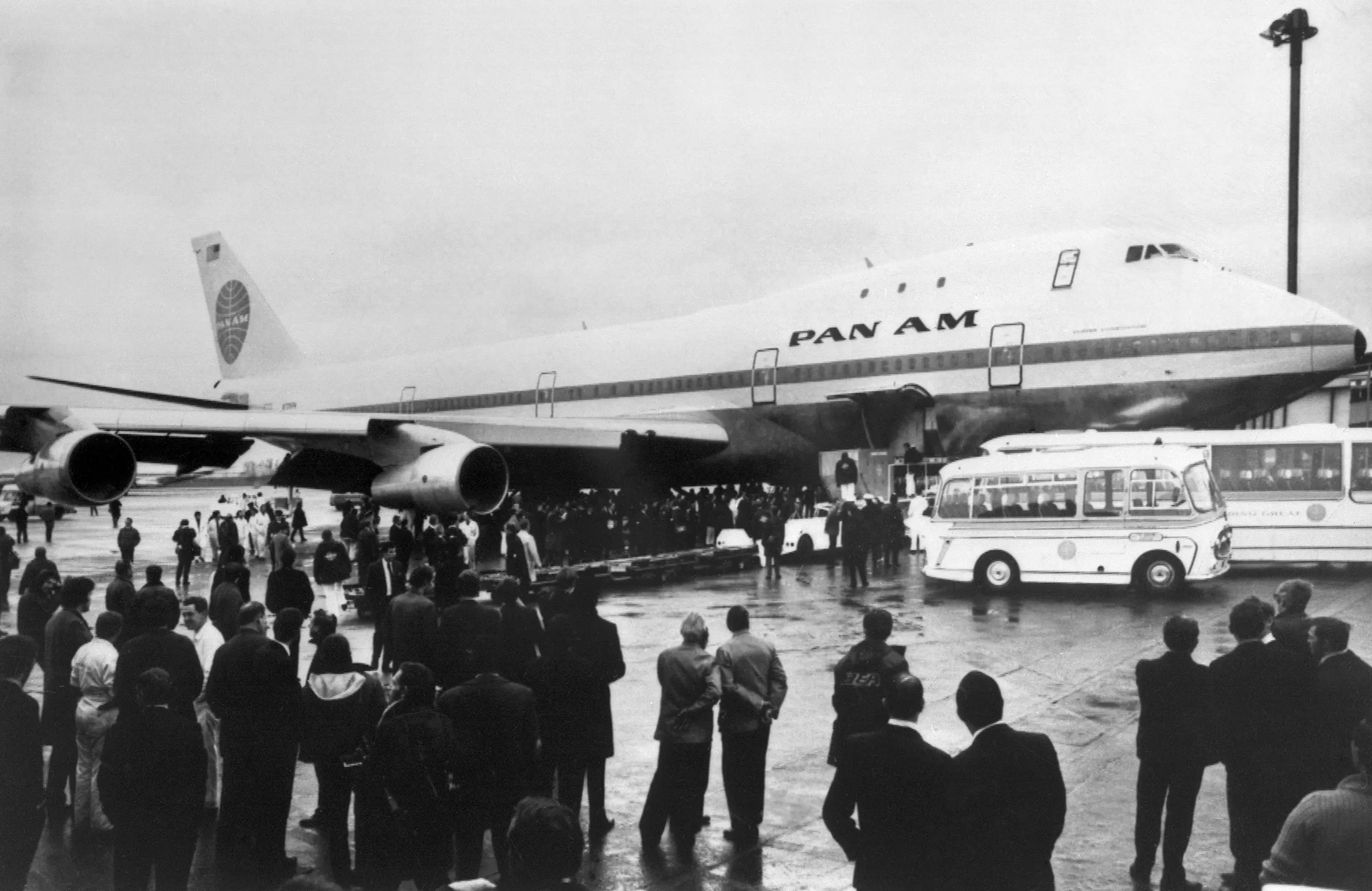 747首次飞往伦敦的航班载着泛美航空的员工和FAA官员前往希思罗机场。来源:Rolls Press/Popperfoto via Getty Images泛美航空首个747载客航班,从纽约飞往伦敦,经历了许多戏剧性事件。原定于1970年1月21日晚上起飞的航班因发动机熄火而延误。随后调来了一架备用的747飞机,最终在午夜过后近两个小时起飞,并于1月22日在伦敦着陆,确保了其在历史书中的地位。