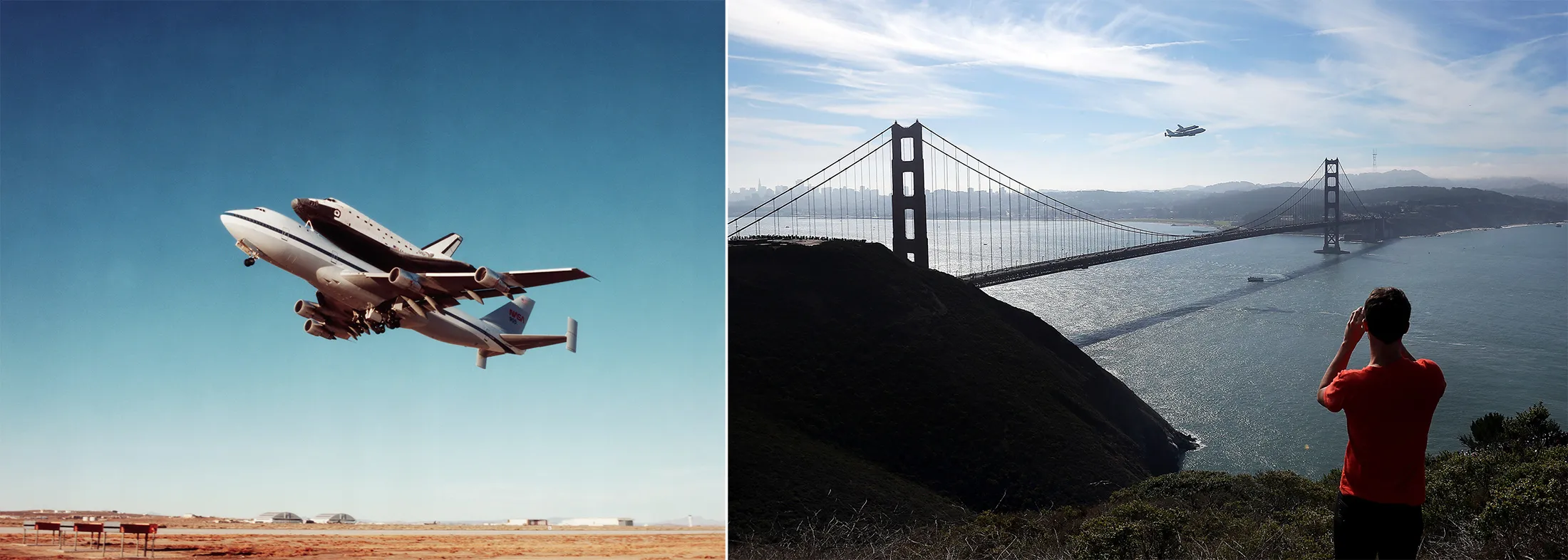 摄影师:Corbis 通过 Getty Images,Justin Sullivan/Getty ImagesNASA 找到了 747 的新用途:提供背负运输其可重复使用的轨道航天器,持续了三十年。左侧,747 航天飞机运输机从加利福尼亚州爱德华兹的德赖登飞行研究中心起飞,背上装载着航天飞机亚特兰蒂斯(左)。右侧,一名观众拍摄了在 2012 年 9 月 21 日加利福尼亚州索萨利托上空飞过金门大桥的改装 747 上的航天飞机奋进号的照片。